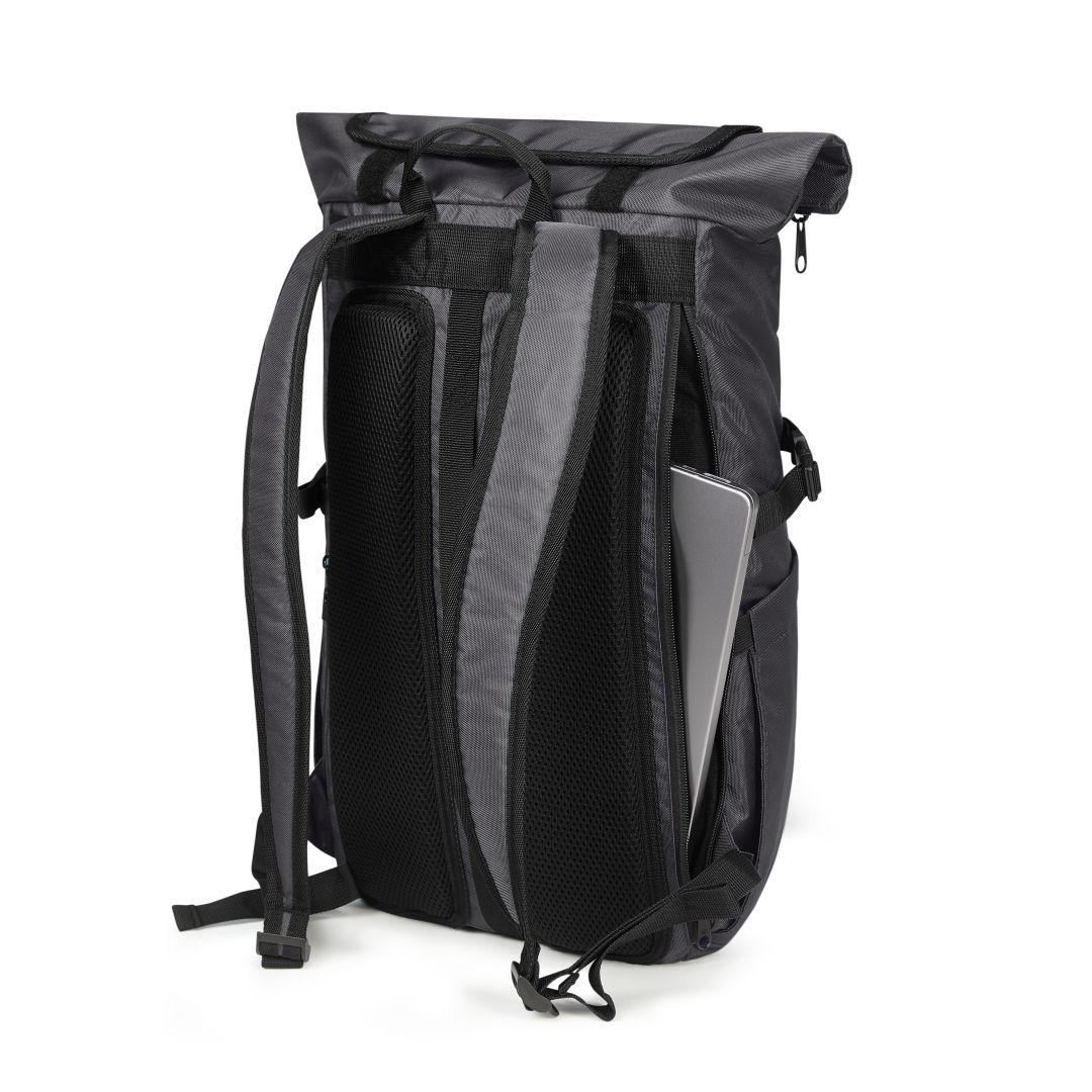 Immer schön flexibel bleiben: bei diesem Notebook-Rucksack ist das Programm und steckt schon im Namen. Im Handumdrehen lässt sich sein Volumen um einiges erweitern. Dafür sorgt die Klappe mit Roll-Top. Für die alltägliche Fahrt ins Büro kommt das Laptop ins rückseitig zugängliche Fach, die Zeitung und Trinkflasche in die Seitentaschen und die Regenjacke fürs Radfahren ist im Elastikband-System bei einem kurzen Schauer direkt griffbereit. Für den Ausflug am Wochenende ist sprichwörtlich mehr drin: da passt auch mal ein Federball-Schläger ins verlängerte Hauptfach und ein Regenschirm ins Seitenfach mit Fixiergurt. Und auf Reisen ist der Notebook-Rucksackdank Befestigungsschlaufe für Trolley-Gestänge ein Begleiter, der es einem wirklich leicht macht. Doch wo auch immer er gerade im Einsatz ist: überallschmeichelt er mit seinem seidigen Glanz, dem nachhaltigen Recycelmaterial, dem Veloursfutter im Laptopfach und dem geradlinigen Design.