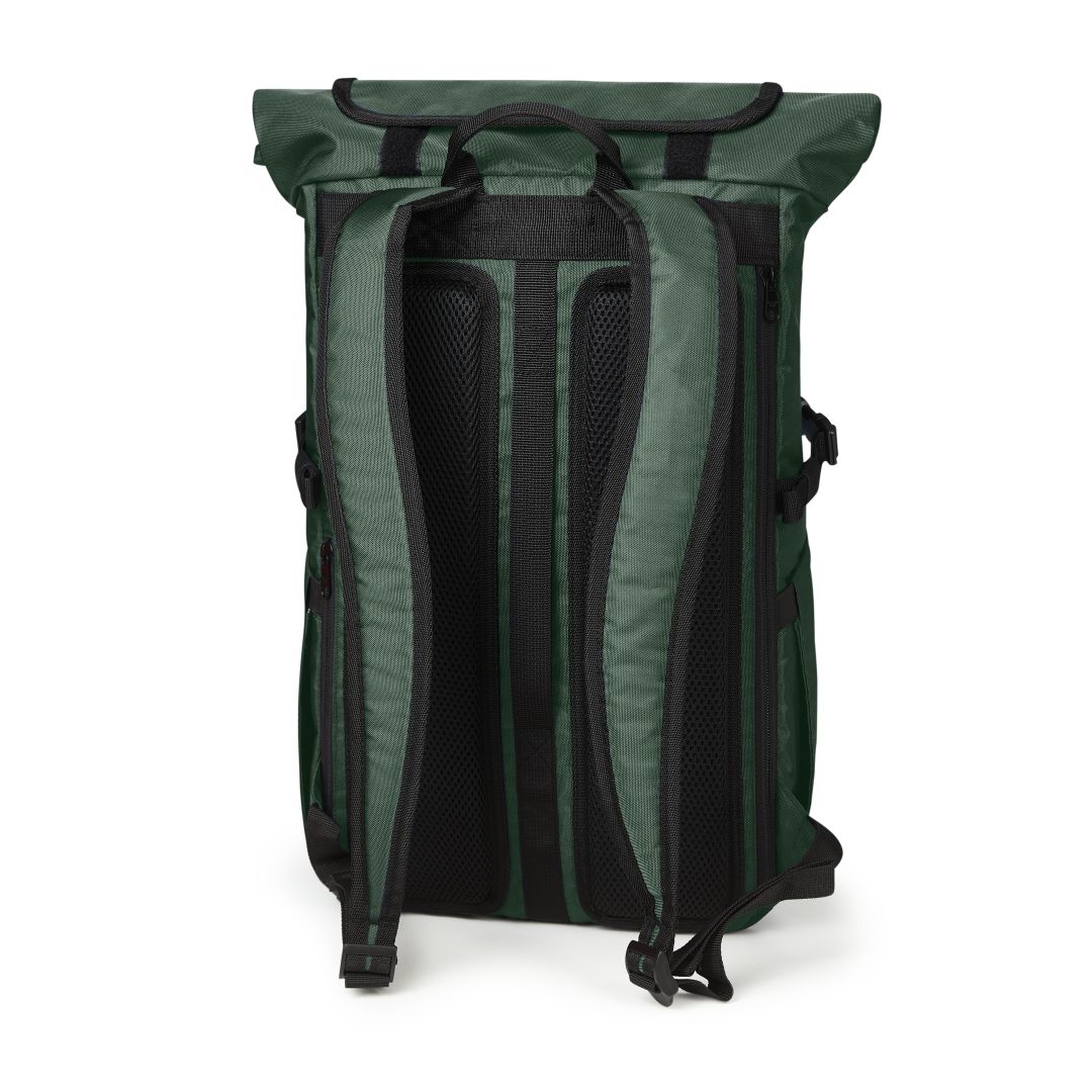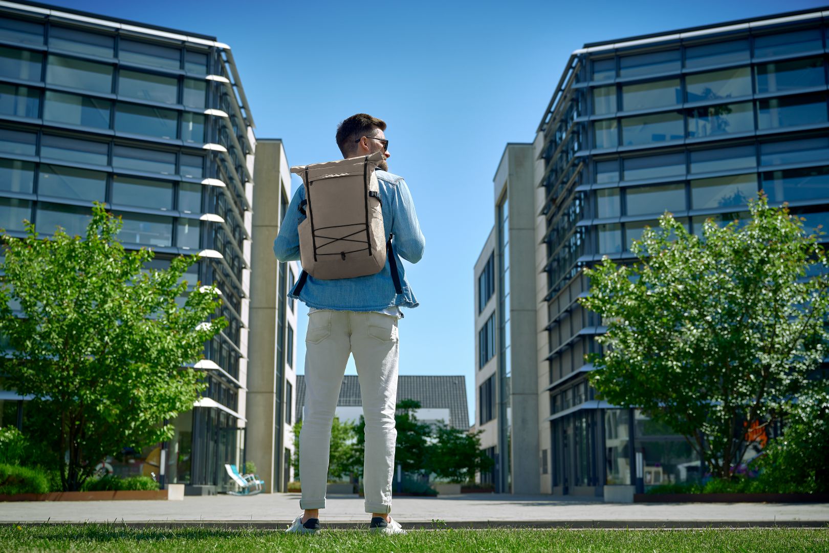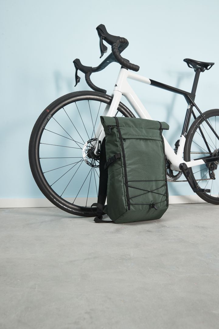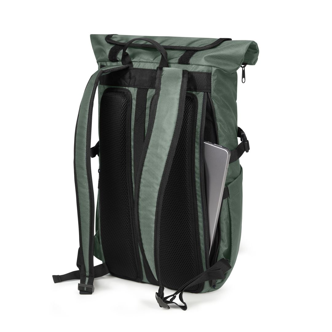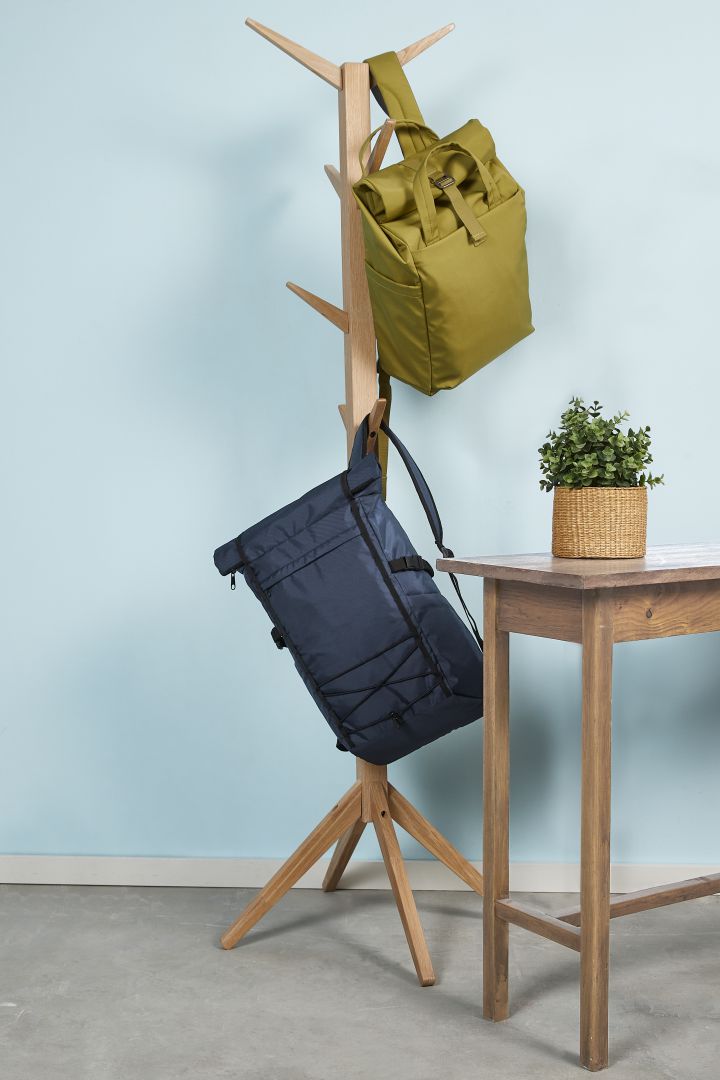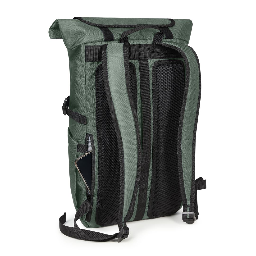 Immer schön flexibel bleiben: bei diesem Notebook-Rucksack ist das Programm und steckt schon im Namen. Im Handumdrehen lässt sich sein Volumen um einiges erweitern. Dafür sorgt die Klappe mit Roll-Top. Für die alltägliche Fahrt ins Büro kommt das Laptop ins rückseitig zugängliche Fach, die Zeitung und Trinkflasche in die Seitentaschen und die Regenjacke fürs Radfahren ist im Elastikband-System bei einem kurzen Schauer direkt griffbereit. Für den Ausflug am Wochenende ist sprichwörtlich mehr drin: da passt auch mal ein Federball-Schläger ins verlängerte Hauptfach und ein Regenschirm ins Seitenfach mit Fixiergurt. Und auf Reisen ist der Notebook-Rucksackdank Befestigungsschlaufe für Trolley-Gestänge ein Begleiter, der es einem wirklich leicht macht. Doch wo auch immer er gerade im Einsatz ist: überallschmeichelt er mit seinem seidigen Glanz, dem nachhaltigen Recycelmaterial, dem Veloursfutter im Laptopfach und dem geradlinigen Design.