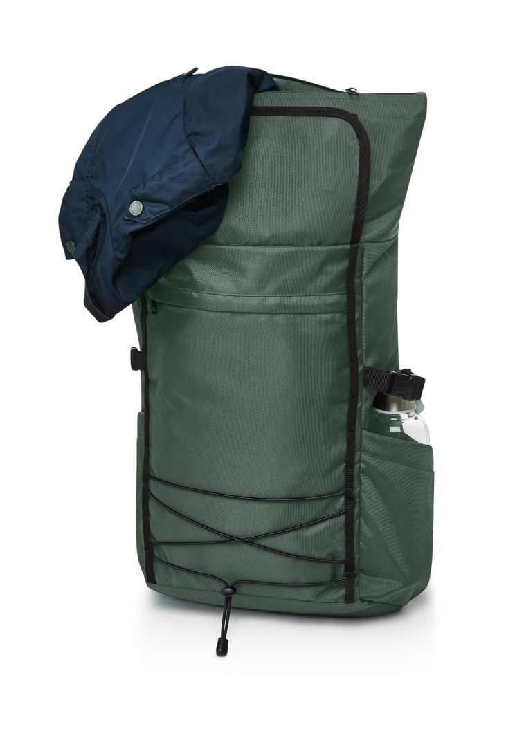 vielseitiger Rucksack mit innovativer Volumenerweiterung; rPET-Obermaterial; geräumiges Hauptfach mit Reißverschluss; flaches Einsteckfach innen; große Reißverschluss-Vortasche; funktionales Schlaufenband mit Elastikkordel; zwei seitliche Einsteckfächer für z.B. Trinkflaschen; Fixiergurte; rückseitig separat zugängliches Notebookfach mit Veloursfutter; gepolstertes Tragesystem; rückseitig verstecke Reißverschluss-Tasche; gepolsterter Boden; Handgriffe auf der Rückseite auch als Befestigungsschlaufe für Trolley-Gestänge nutzbar; Tragegriff