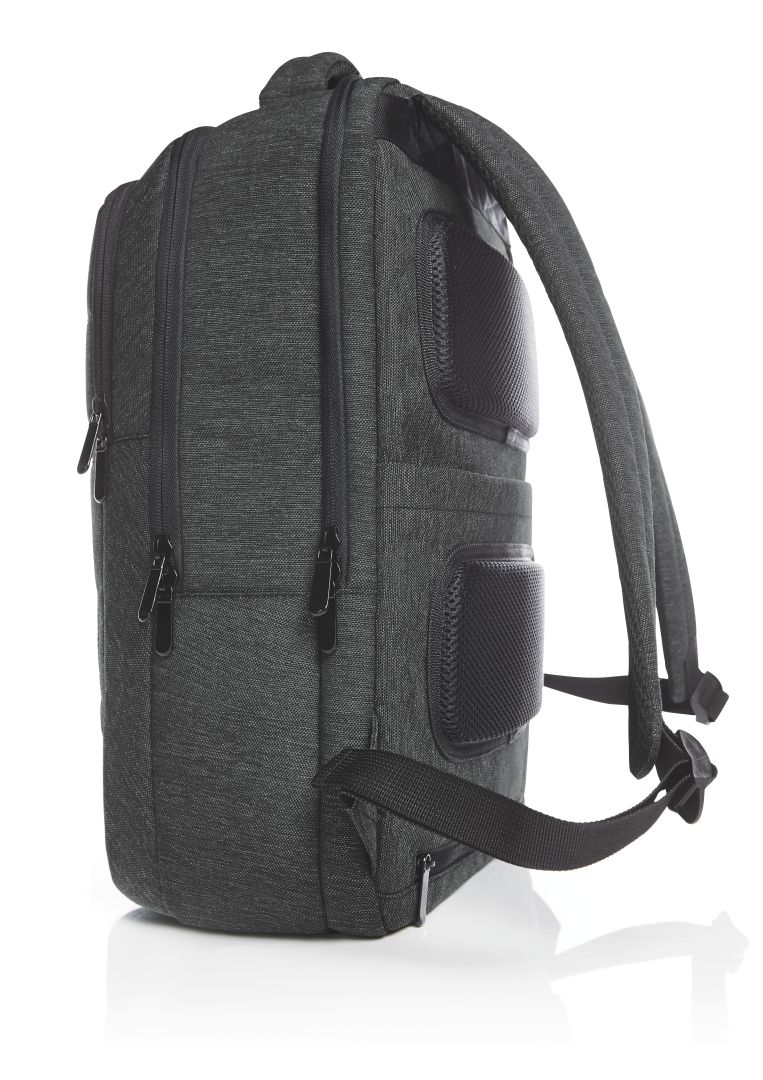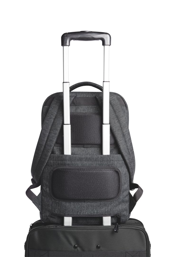 gepolsterter Businessrucksack mit aufwändig gesteppter Front und HFL® Träger für Ihr Logo; gepolstertes Hauptfach mit flachem Einsteckfach geeignet für DIN A4-Unterlagen; Reißverschluss-Vortasche mit zwei flachen Einsteckfächern; gepolstertes Reißverschluss-Notebookfach; gepolsterter Rücken mit verstecktem Reißverschluss-Fach auch zur Befestigung am Trolley-Gestänge geeignet; längenverstellbare gepolsterte Schultergurte; gepolsterter Handgriff