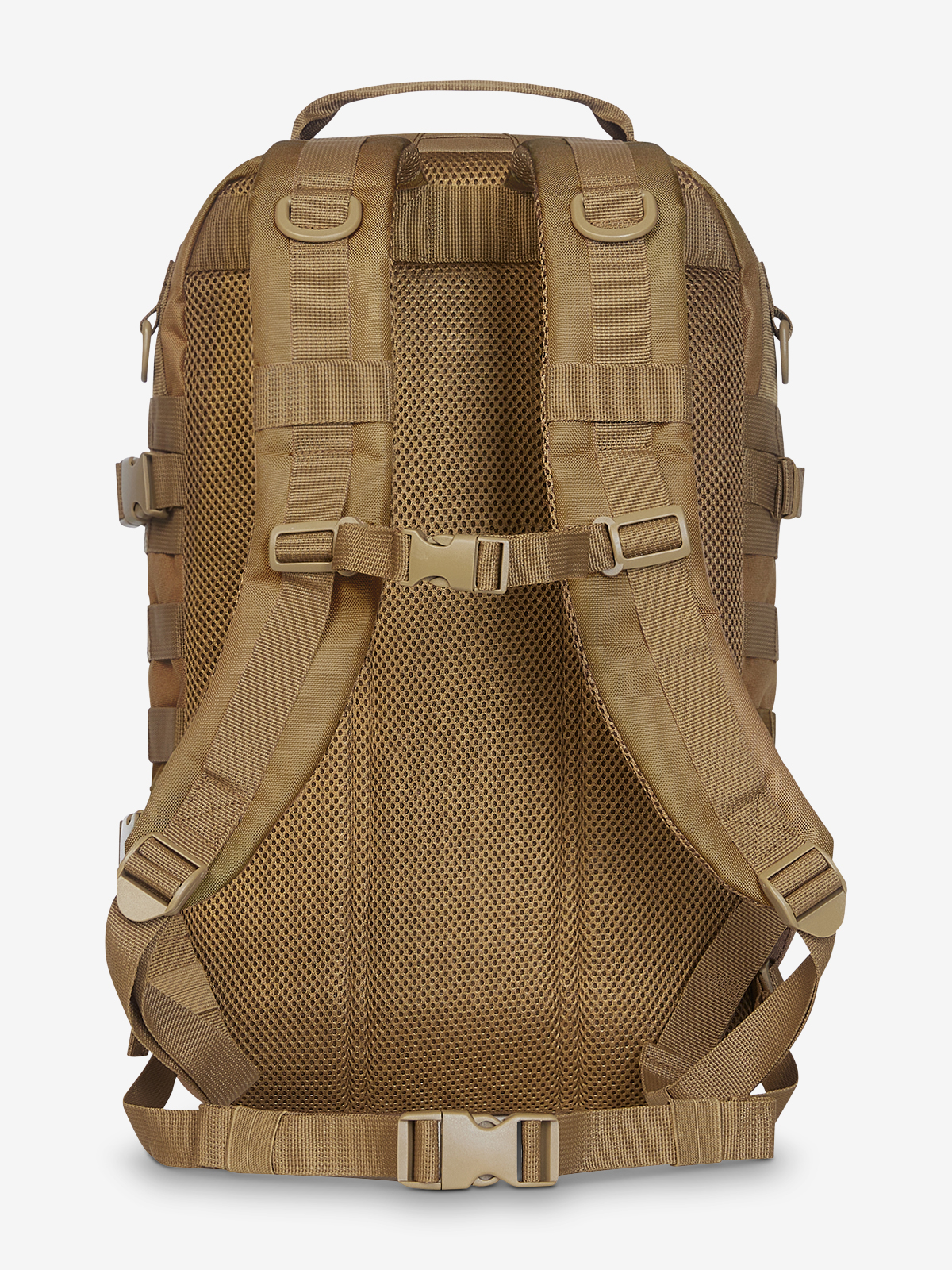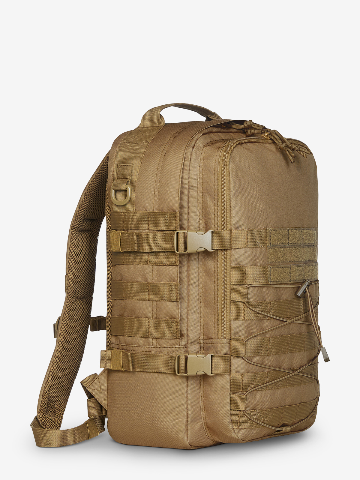 funktionaler Rucksack mit 3-seitigem Molle-Bandsystem und Klett-Besatz; elastischer Kordelbesatz; großes Hauptfach mit verdecktem 2-Wege-Reißverschluss; gepolstertes Notebook-Fach mit Klettlasche; Auslass für Kabel oder Trinkschlauch; großes Reißverschluss-Netzfach; Reißverschluss-Vortasche mit 2-Wege-Reißverschluss und Organizer-Fächern; seitliche Kompressionsgurte mit Steckschnallen, auch vorne und rückseitig schließbar z.B. für Befestigung am Trolley-Gestänge; rechts und linksseitig D-Ringe; gepolstertes Rückentragesystem mit höhenverstellbarer Brustgurt; D-Ringe und Bandlaschen auf den Trägern; abnehmbarer, längenverstellbarer Hüftgurt; Handgriff