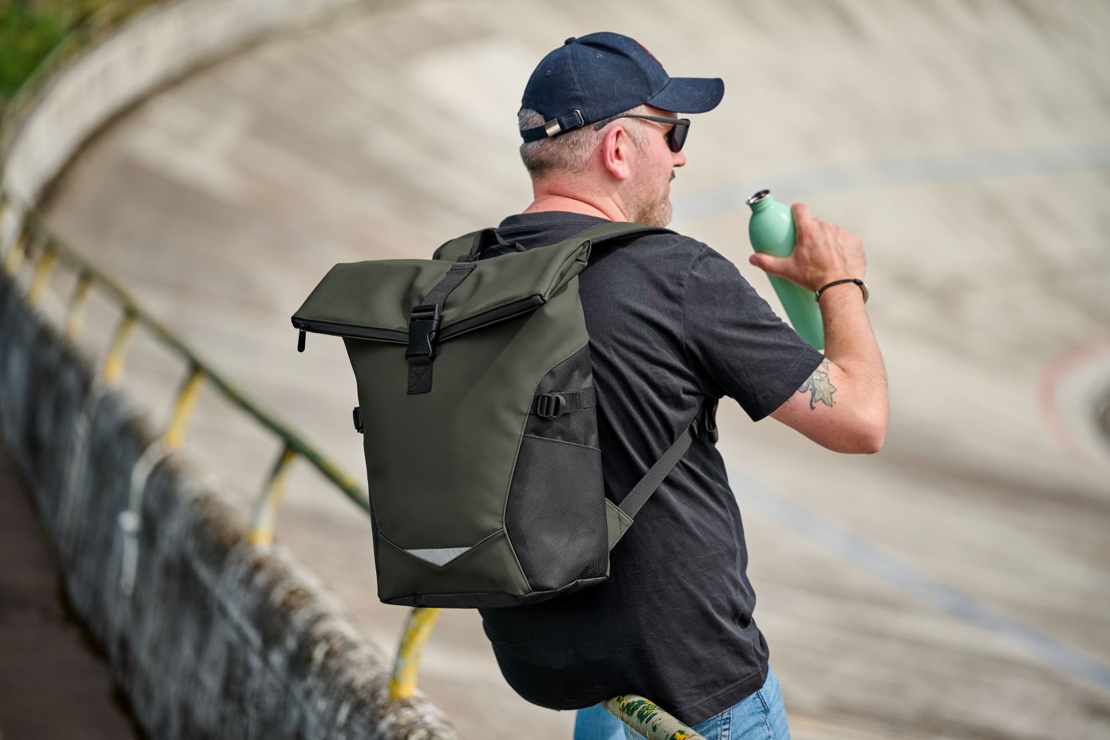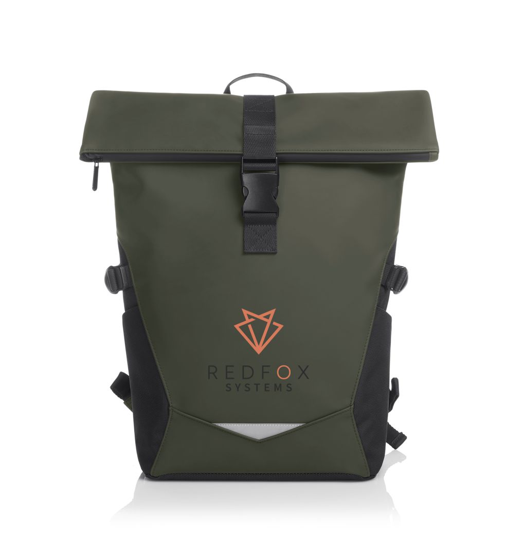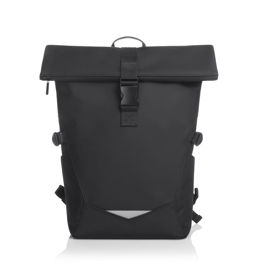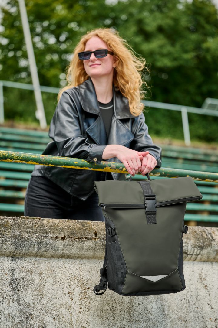 dynamischer Rolltop-Rucksack; Reißverschluss-Hauptfach mit Steckverschluss; große Reißverschluss-Vortasche; zwei seitliche Einsteckfächer; Fixiergurte; dekorativer Reflexeinsatz auf der Front; innen gepolstertes Einsteckfach mit Klettsicherung; verstecktes Reißverschluss-Fach rückseitig; aufwändig gepolstertes Tragesystem mit individuell einstellbarem Brustgurt; Hand- sowie Tragegriff
