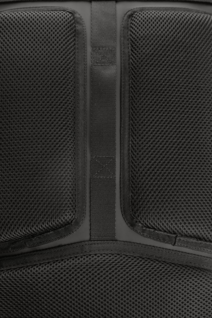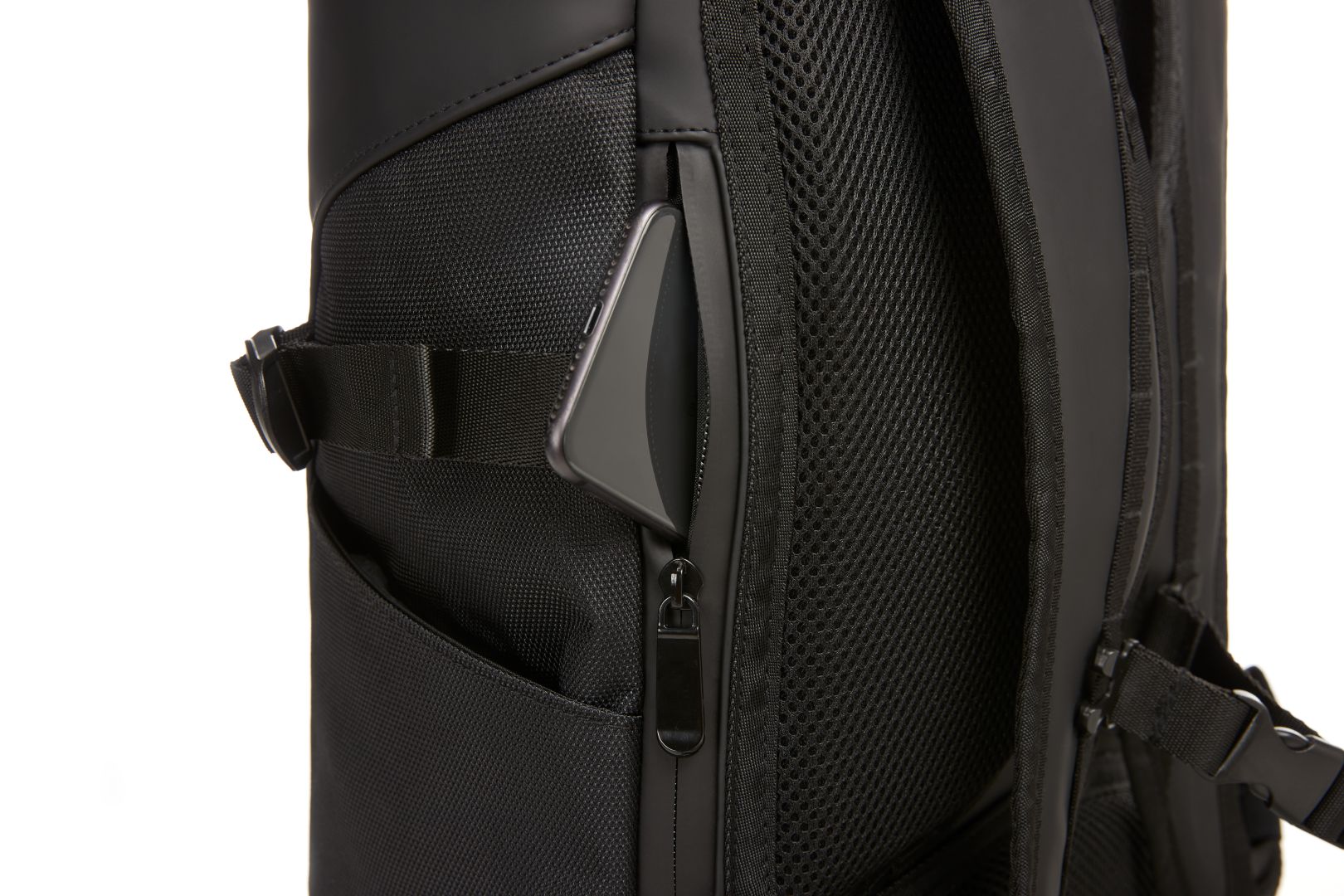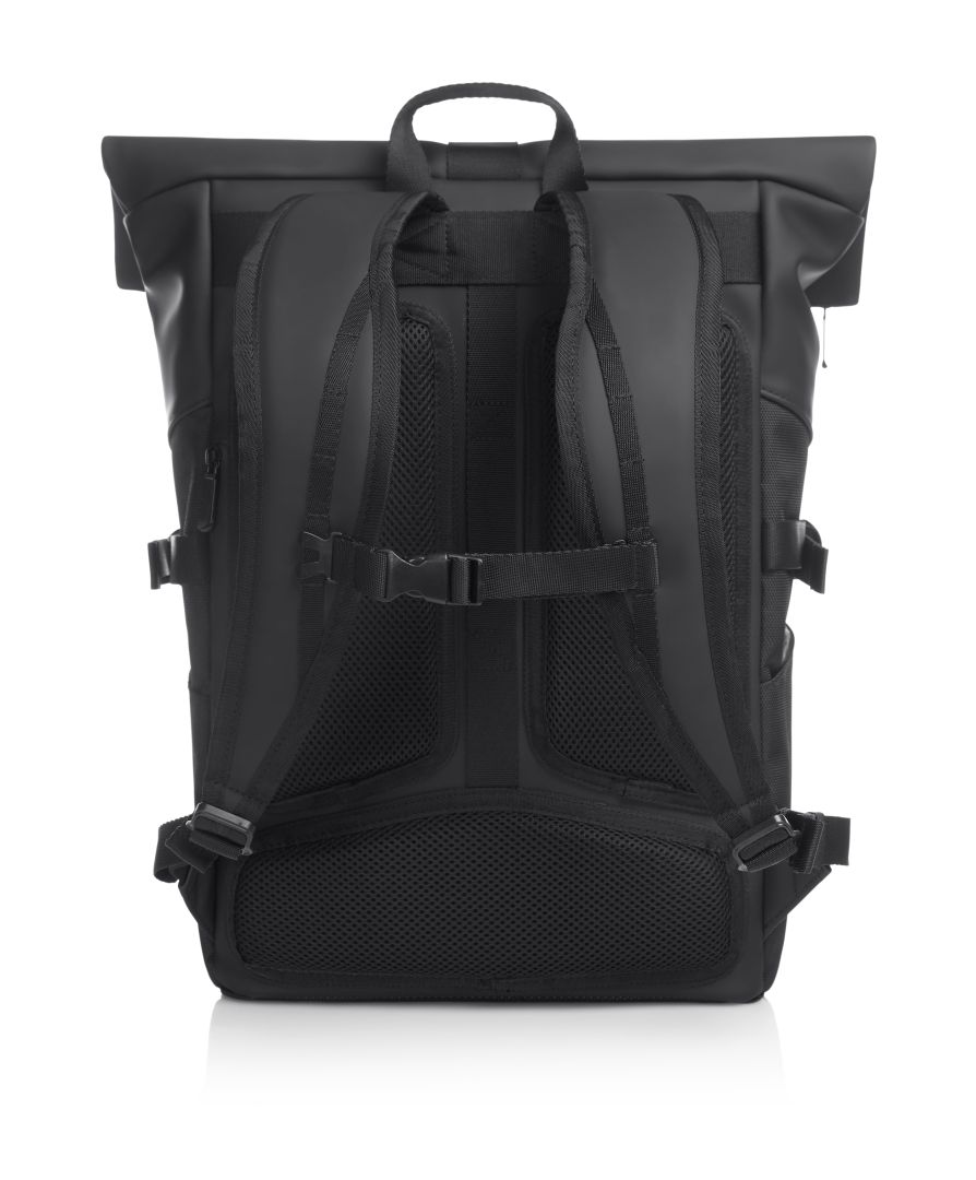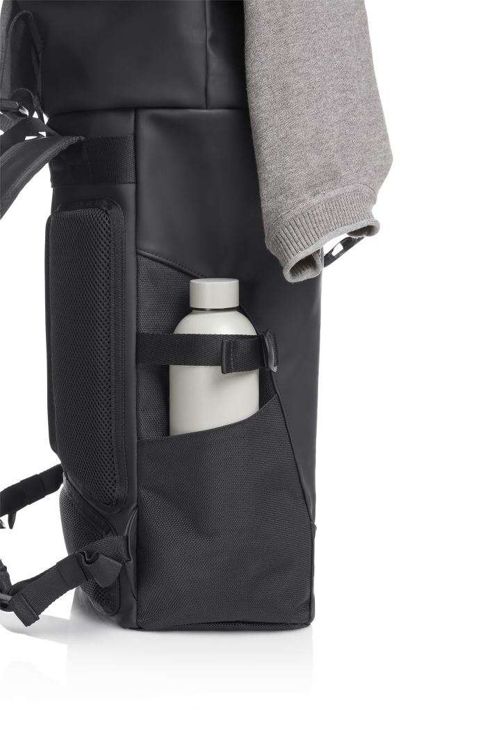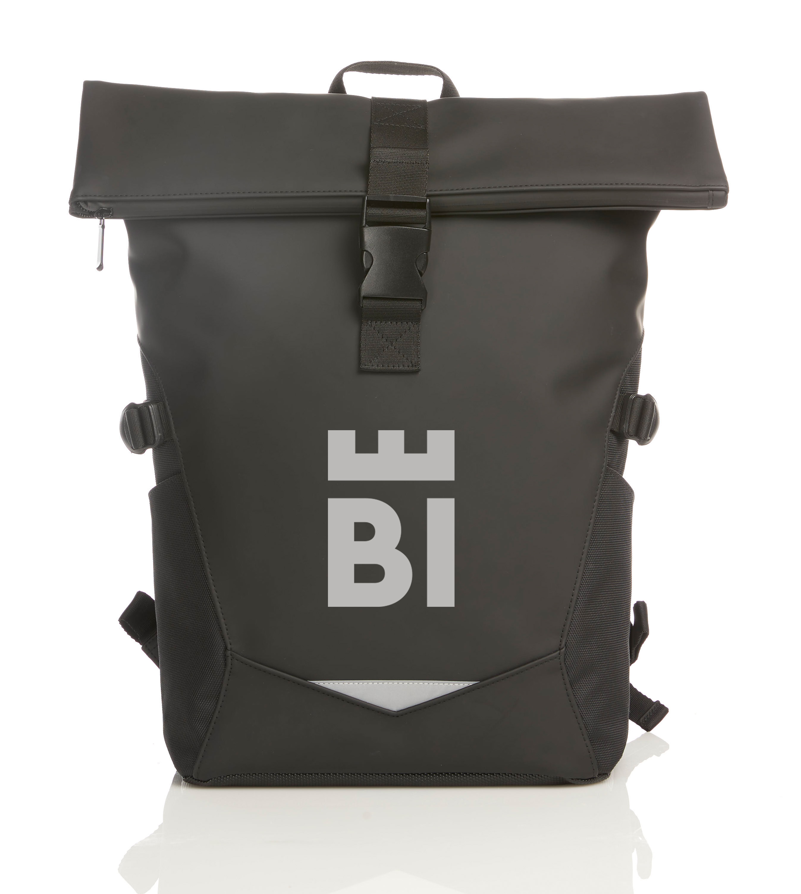 dynamischer Rolltop-Rucksack; Reißverschluss-Hauptfach mit Steckverschluss; große Reißverschluss-Vortasche; zwei seitliche Einsteckfächer; Fixiergurte; dekorativer Reflexeinsatz auf der Front; innen gepolstertes Einsteckfach mit Klettsicherung; verstecktes Reißverschluss-Fach rückseitig; aufwändig gepolstertes Tragesystem mit individuell einstellbarem Brustgurt; Hand- sowie Tragegriff