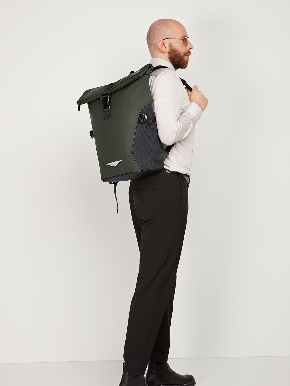 dynamischer Rolltop-Rucksack; Reißverschluss-Hauptfach mit Steckverschluss; große Reißverschluss-Vortasche; zwei seitliche Einsteckfächer; Fixiergurte; dekorativer Reflexeinsatz auf der Front; innen gepolstertes Einsteckfach mit Klettsicherung; verstecktes Reißverschluss-Fach rückseitig; aufwändig gepolstertes Tragesystem mit individuell einstellbarem Brustgurt; Hand- sowie Tragegriff