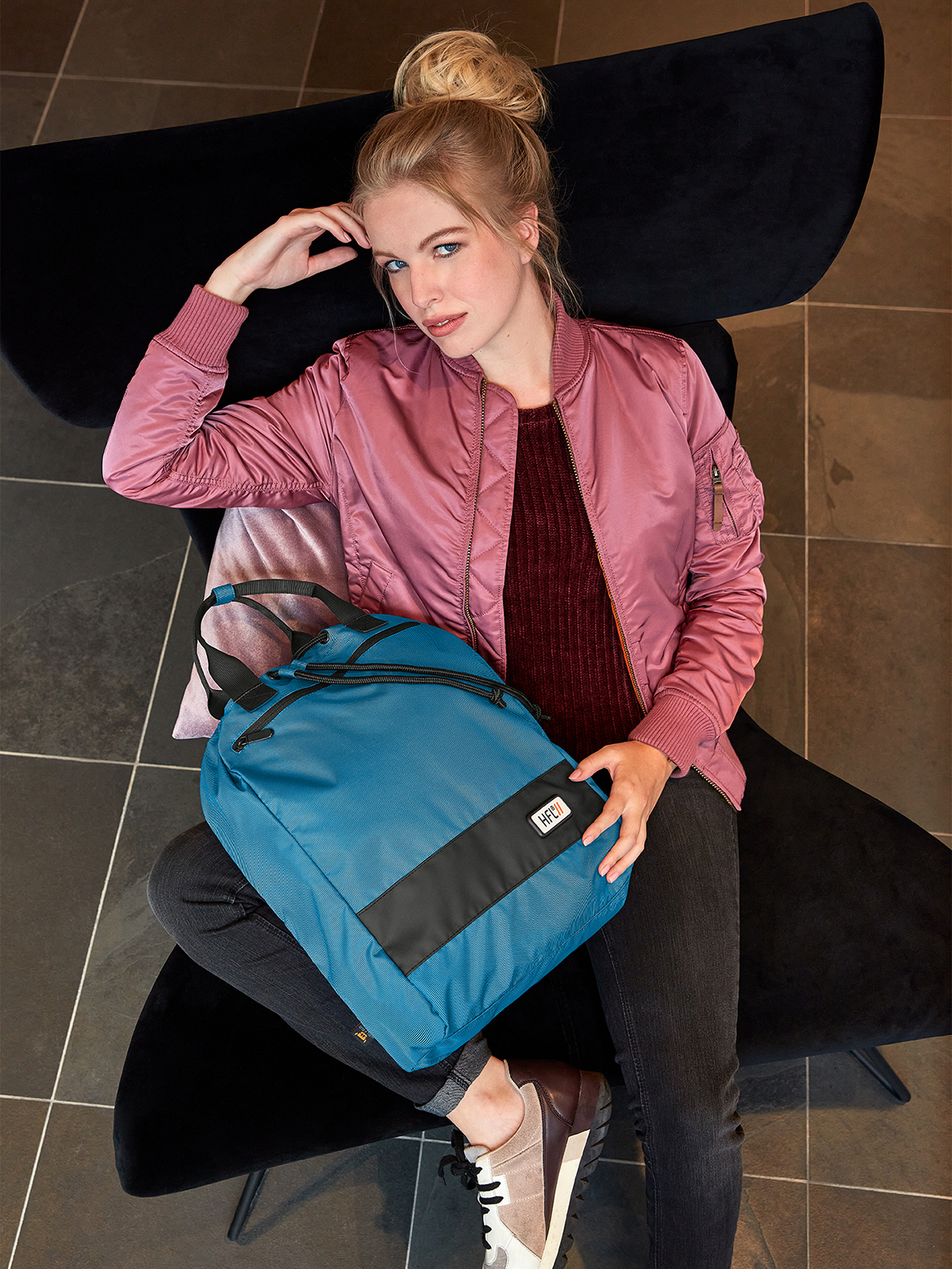 moderner Rucksack mit Kontraststreifen; HFL® Träger für Ihr Logo; großes Hauptfach mit 2-Wege-Reißverschluss; gepolstertes Notebookfach; Einsteckfächer; Stiftschlaufen; große Reißverschluss-Vortasche, gepolsterter Rücken und Schultergurte; Handgriffe mit Druckknopfmanschette