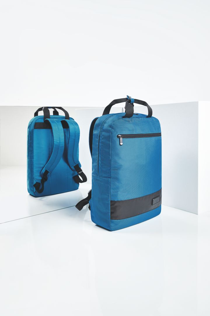 moderner Rucksack mit Kontraststreifen; HFL® Träger für Ihr Logo; großes Hauptfach mit 2-Wege-Reißverschluss; gepolstertes Notebookfach; Einsteckfächer; Stiftschlaufen; große Reißverschluss-Vortasche, gepolsterter Rücken und Schultergurte; Handgriffe mit Druckknopfmanschette