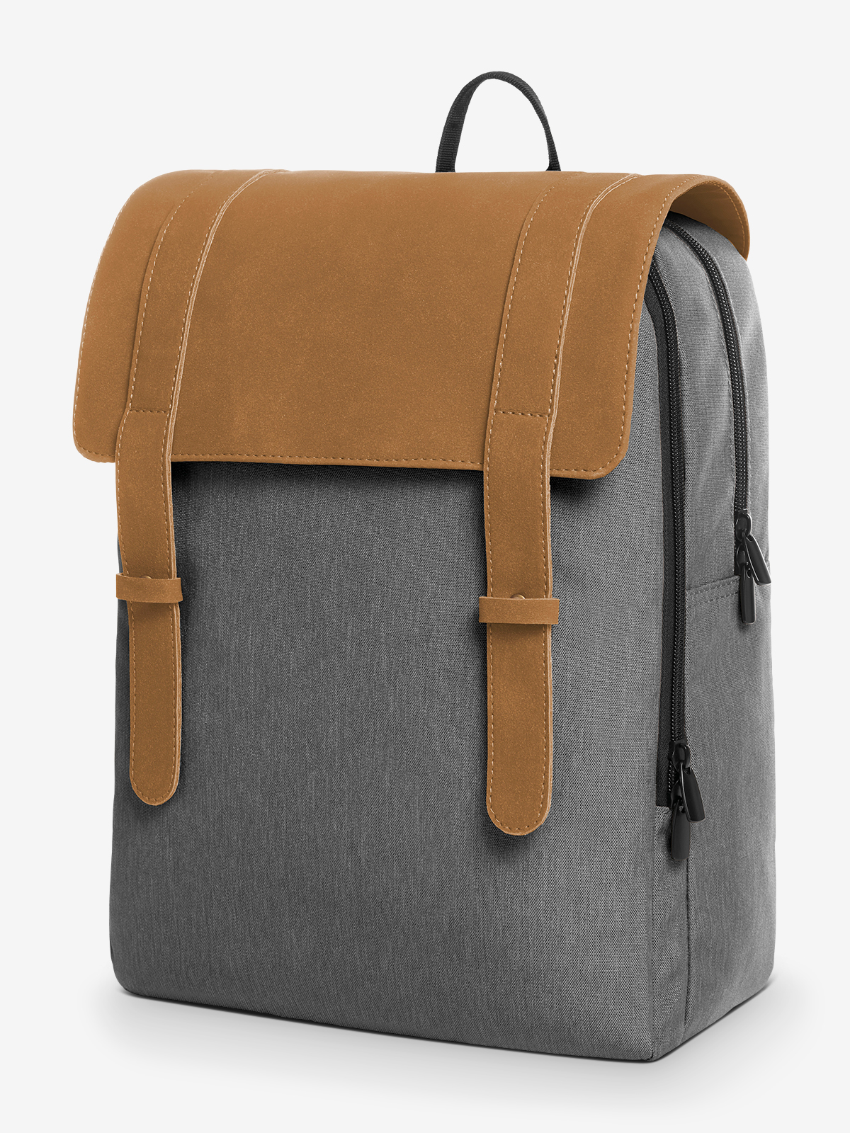junger Notebook-Rucksack mit moderner, geometrischer Schnittführung; Materialmix aus Velours-Kunstleder und Melange-Gewebe; Hauptfach mit gepolstertem Notebookfach; Reißverschluss-Vortasche mit zwei flachen Einsteckfächern; 2-Wege-Reißverschlüsse; gepolsterter Rücken und Schultergurte