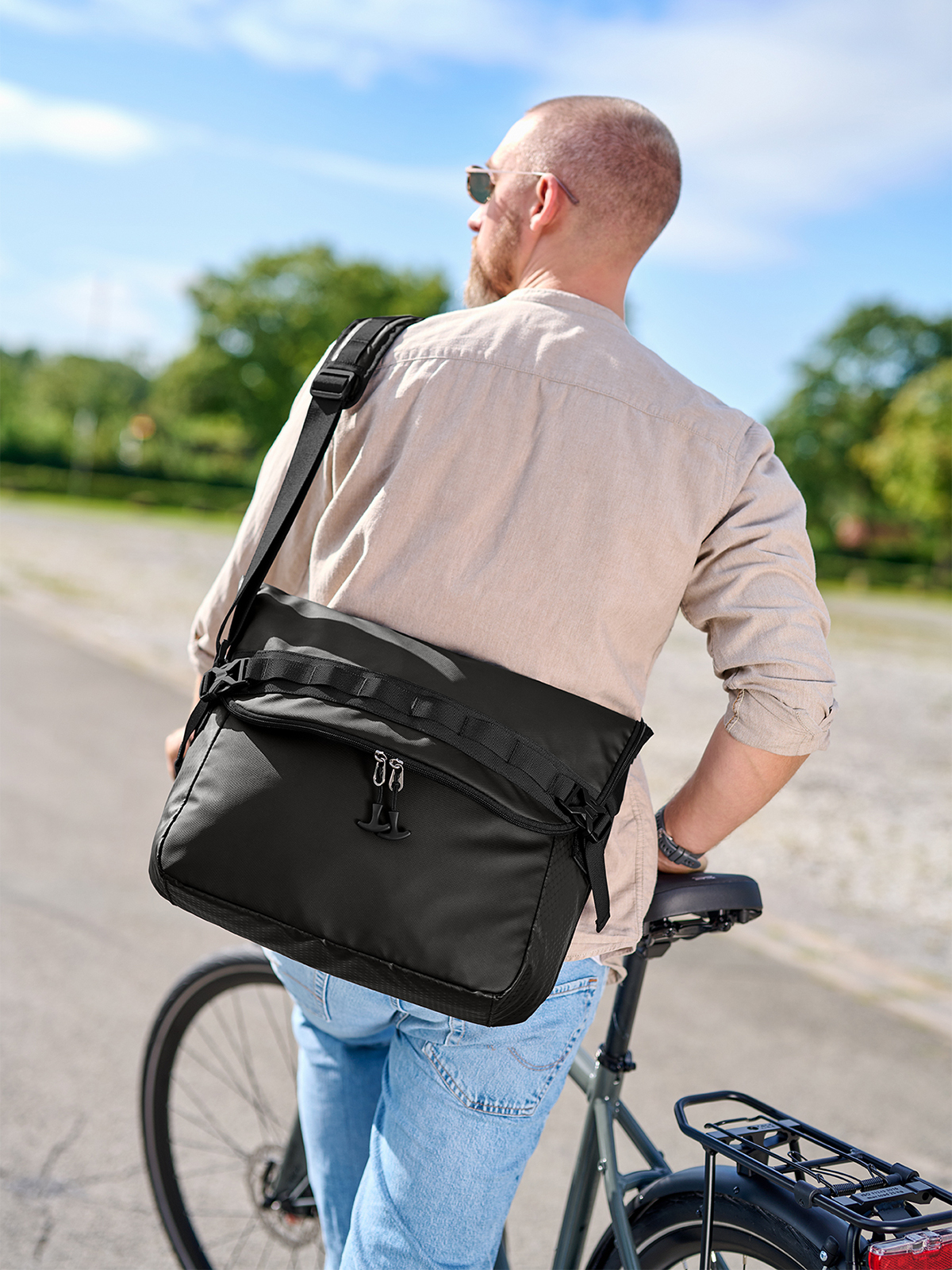 dynamische Notebooktasche; Überschlag mit 2-Wege-Reißverschluss, funktionalem Schlaufenband, seitlichen Steckverschlüssen, zur Volumenerweiterung nutzbar; großes Hauptfach mit Schnellzugriff; gepolstertes Notebookfach mit Klettlasche; zwei Einsteckfächer innen; Reißverschluss-Vortasche; Handgriff und Befestigungsschlaufe für Trolley-Gestänge; rückseitig versteckte Reißverschluss-Tasche; gepolsterter Rücken; gepolsterter Boden; zweiseitig längenverstellbarer Schultergurt mit genähtem Schulterpolster; flexibel fixierbarer Hüftgurt ideal zum Radfahren