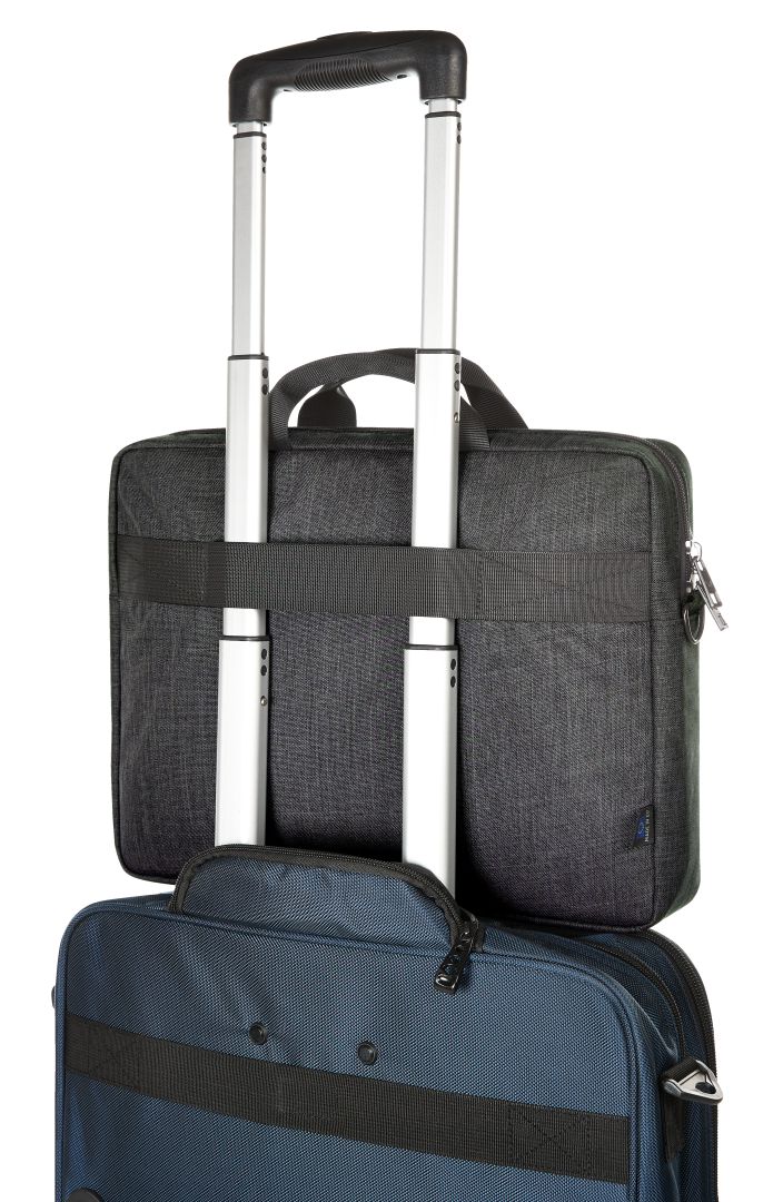 großes, rückseitig gepolstertes Hauptfach mit 2-Wege-Reißverschluss; rPET Obermaterial; wertige Metall-Accessoires; gepolstertes Einsteckfach z.B. für Notebooks; flache Reißverschluss-Vortasche; rückseitige Befestigung für Trolley-Gestänge; abnehmbarer, längenverstellbarer Schultergurt; Handgriffe