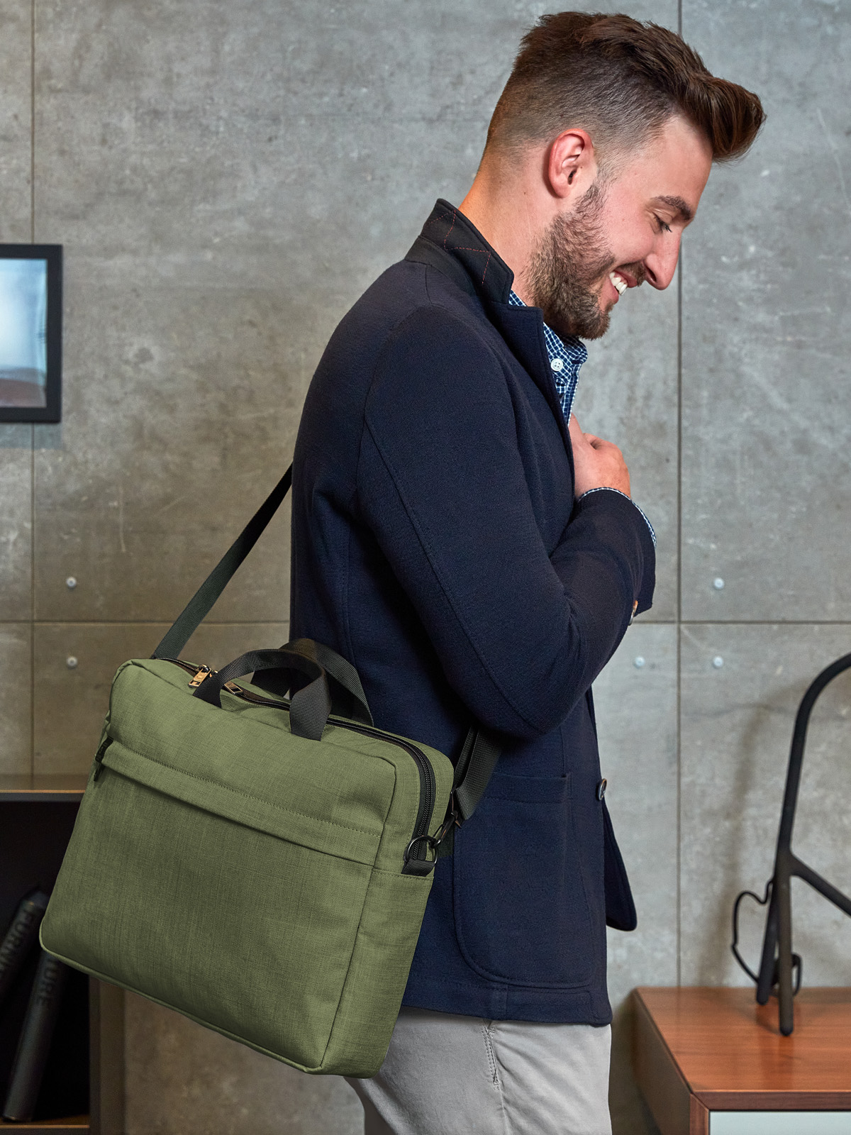 großes, rückseitig gepolstertes Hauptfach mit 2-Wege-Reißverschluss; rPET Obermaterial; wertige Metall-Accessoires; gepolstertes Einsteckfach z.B. für Notebooks; flache Reißverschluss-Vortasche; rückseitige Befestigung für Trolley-Gestänge; abnehmbarer, längenverstellbarer Schultergurt; Handgriffe