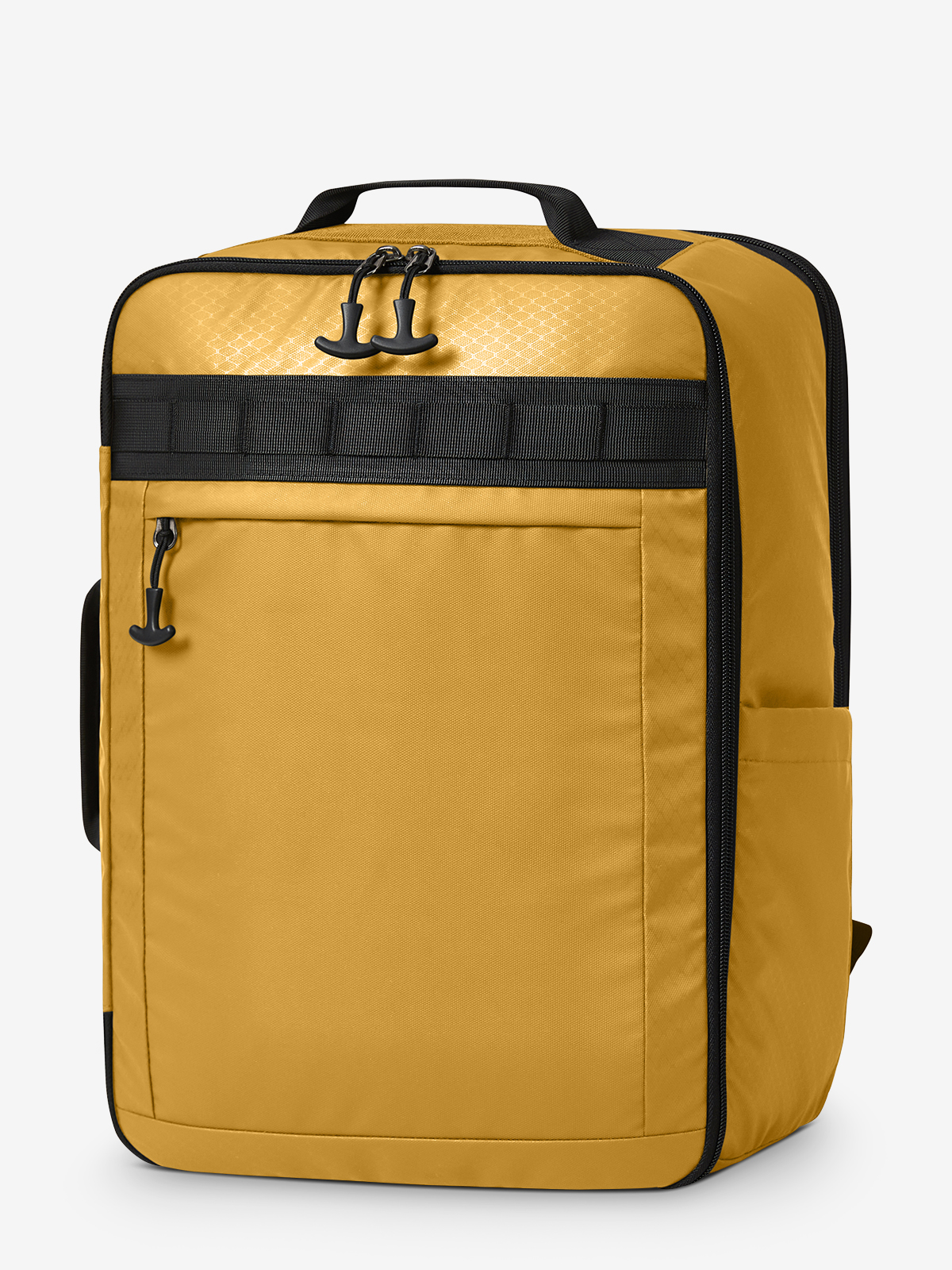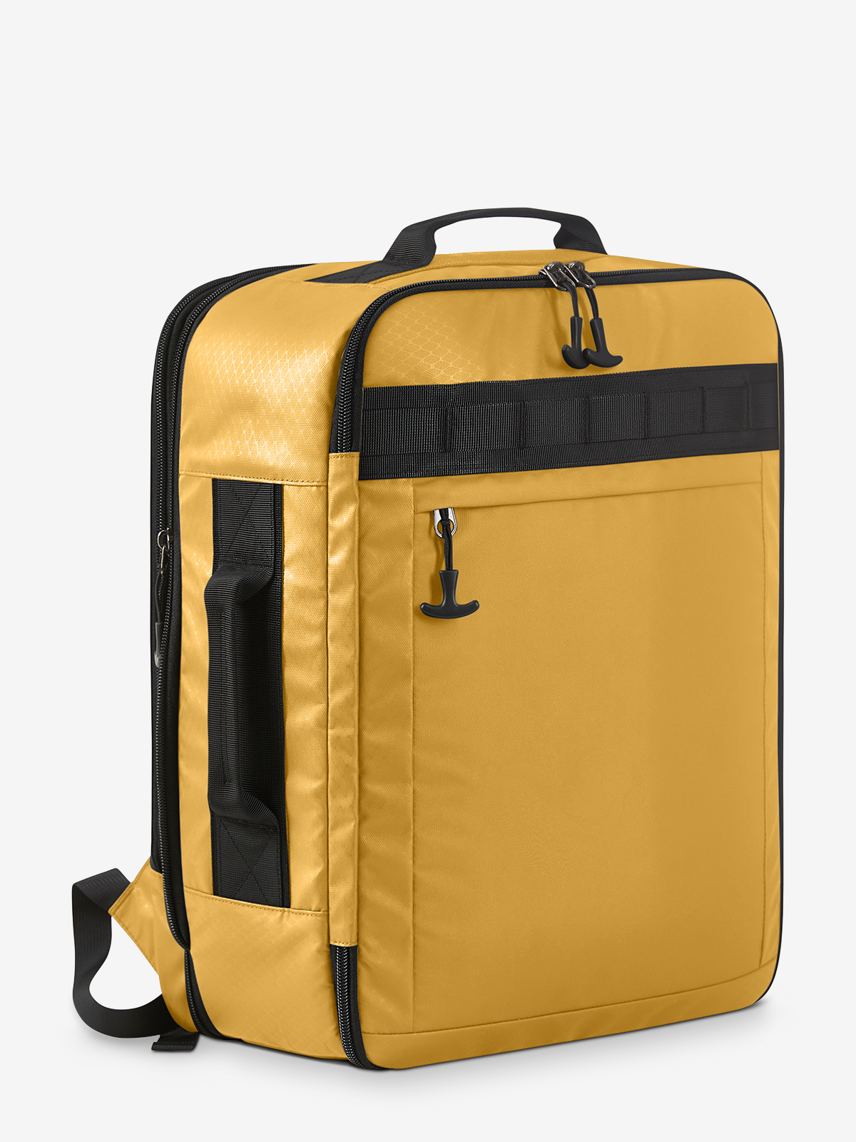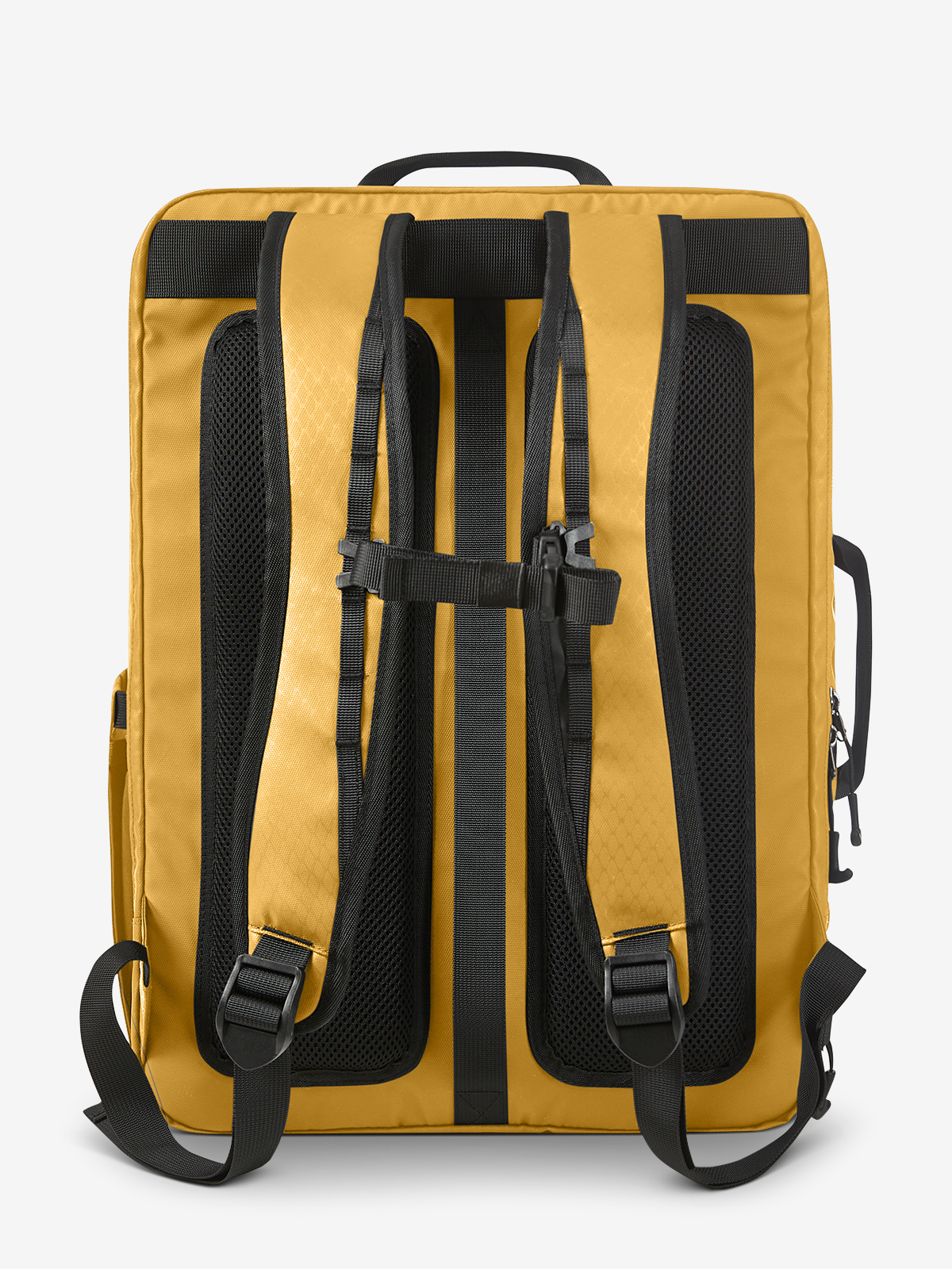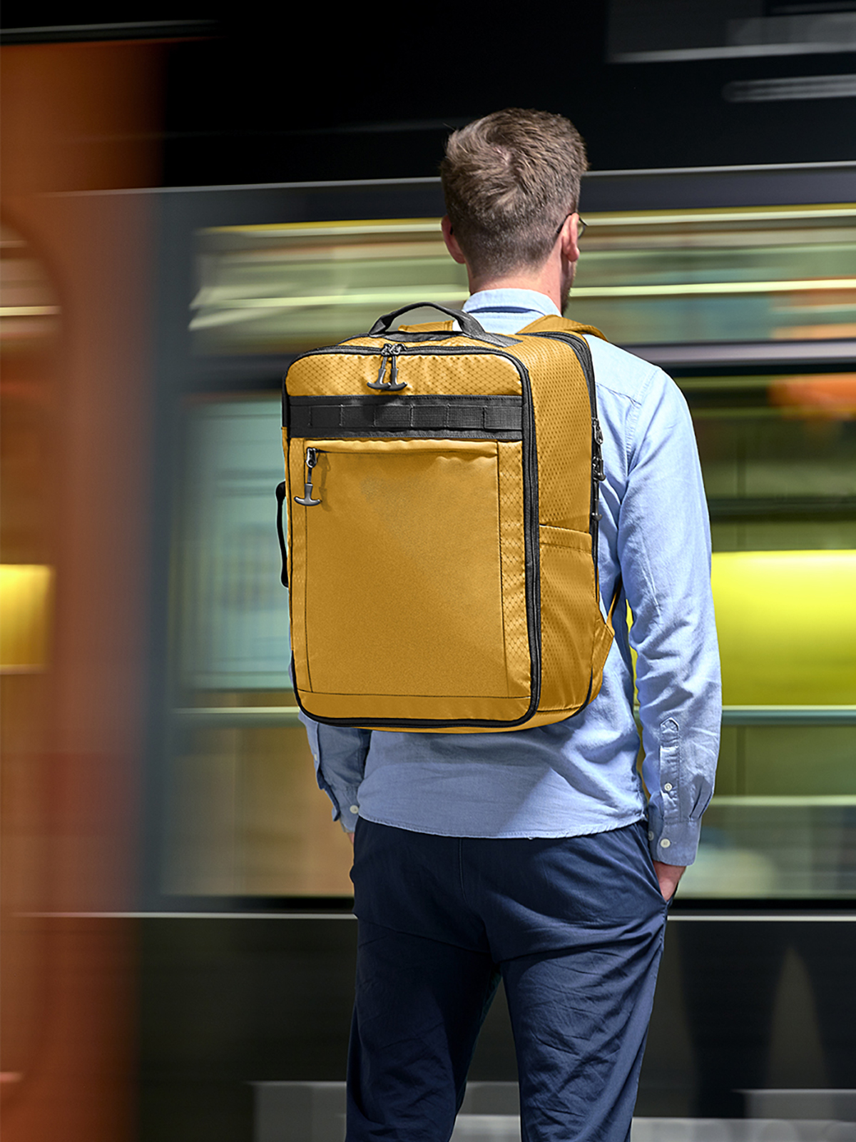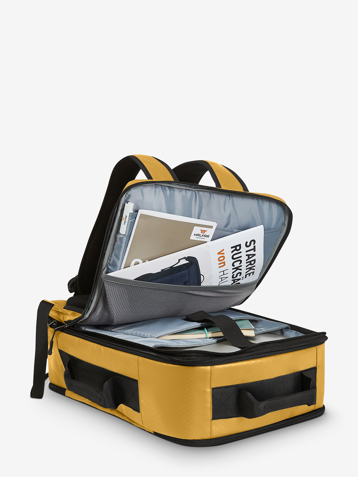 geräumiger Business-Rucksack; große Reißverschluss-Vortasche und Schlaufenband; seitliches Einsteckfach; zwei Handgriffe; großes, gepolstertes Gepäck-Hauptfach mit Netzdeckel, 2-Wege-Reißverschluss sowie seitlichem Netz-Einsteckfach und Schlüsselband; zwei Reißverschluss-Netztaschen im Hauptfachdeckel; Volumenerweiterung Hauptfach; separat zugängliches 2-Wege-Reißverschlussfach für Arbeitsausstattung: Tablet- und Notebookfach, beide mit Veloursfutter und elastische Fixierschlaufe; Netzfach; Einsteckfach geeignet für A4-Unterlagen; Stiftschlaufe; gut gepolstertes Rückentragesystem mit verstellbarem Brustgurt; rückseitig Befestigungsschlaufe für Trolley-Gestänge
