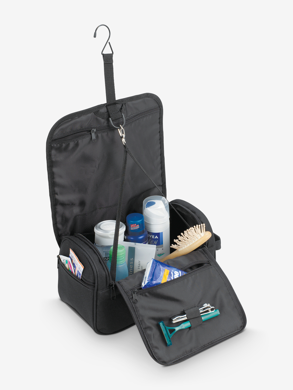 Wer möchte das nicht: selbst nach einer langen Reise gepflegt und erfrischt ankommen. HALFAR® hat dafür einige schöne Lösungen in Taschenform entwickelt. Mit einem aufwändigeren Innenleben wartet das Reisenecessaire BUSINESS auf. Mit einem gepolsterten Hauptfach und zwei Reißverschluss-Einsteckfächern hat es viel Platz für Fläschchen, Tuben und Tiegelchen. Praktisch: das kleine Schwarze von HALFAR® kann man aufstellen oder auch aufhängen. Zusammengeklappt zeigt sich das Reisenecessaires BUSINESS mit aufgedrucktem oder gesticktem Logo von seiner besten Seite.