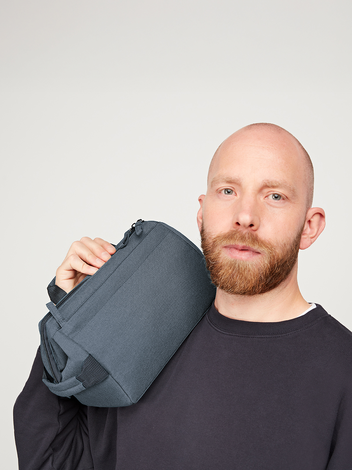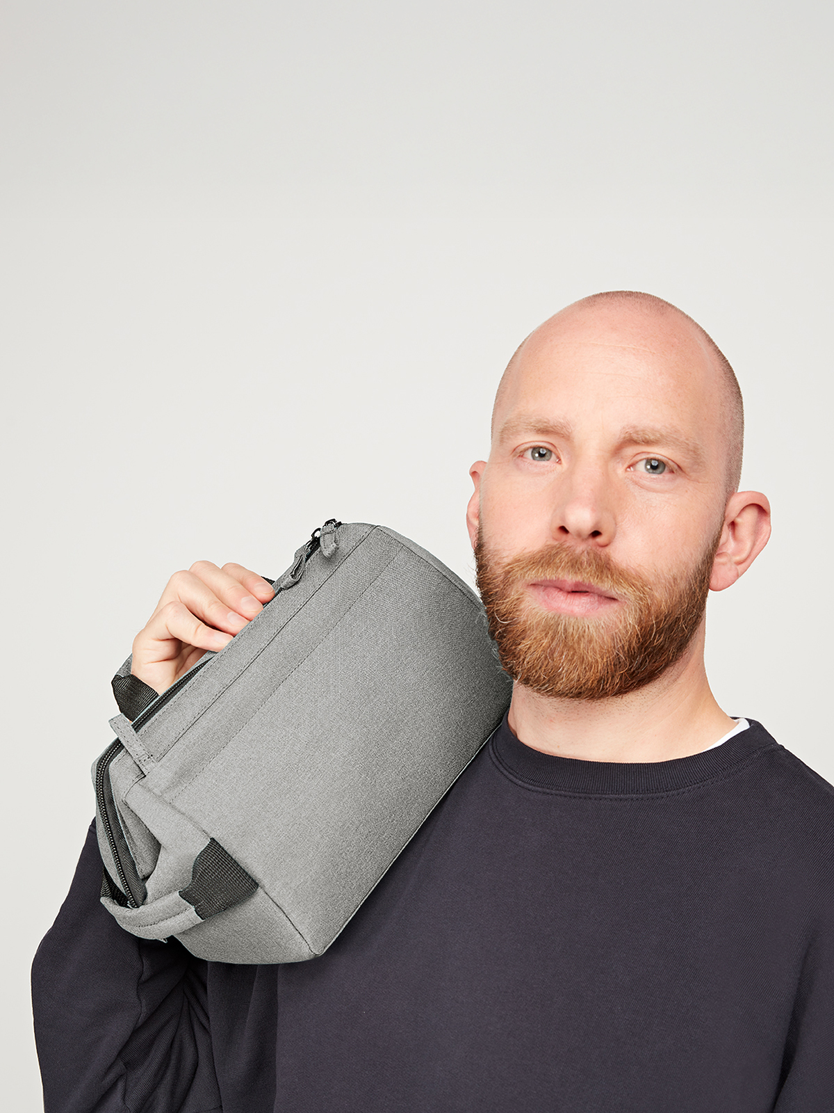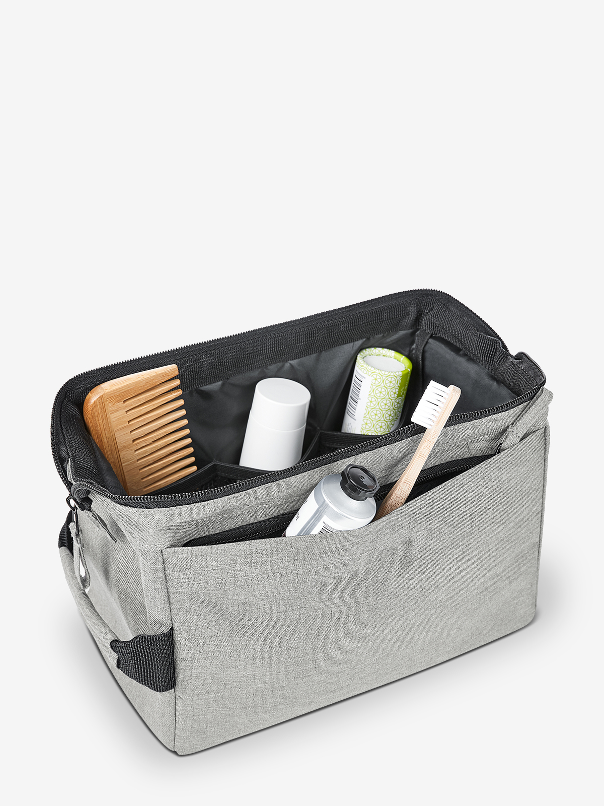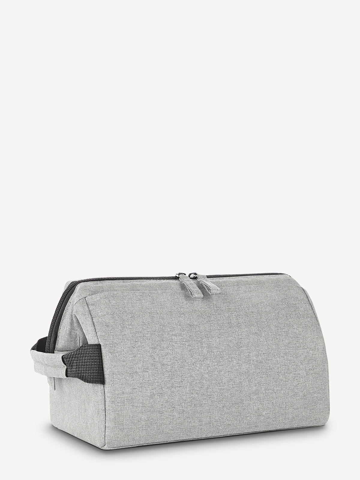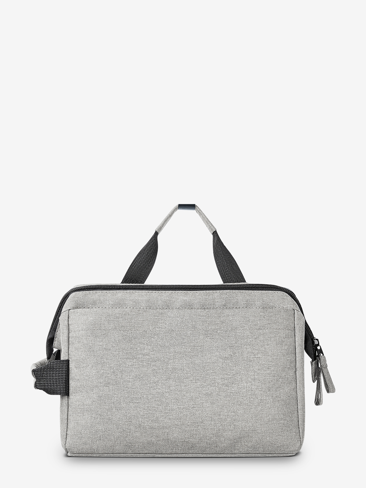 formschöne Reißverschlusstasche mit stabiler Metallbügelöffnung zum Aufstellen oder -hängen; rPET-Obermaterial; großes, gepolstertes Hauptfach mit diversen Organizer-Elementen; Reißverschlussvortasche; Handgriff
