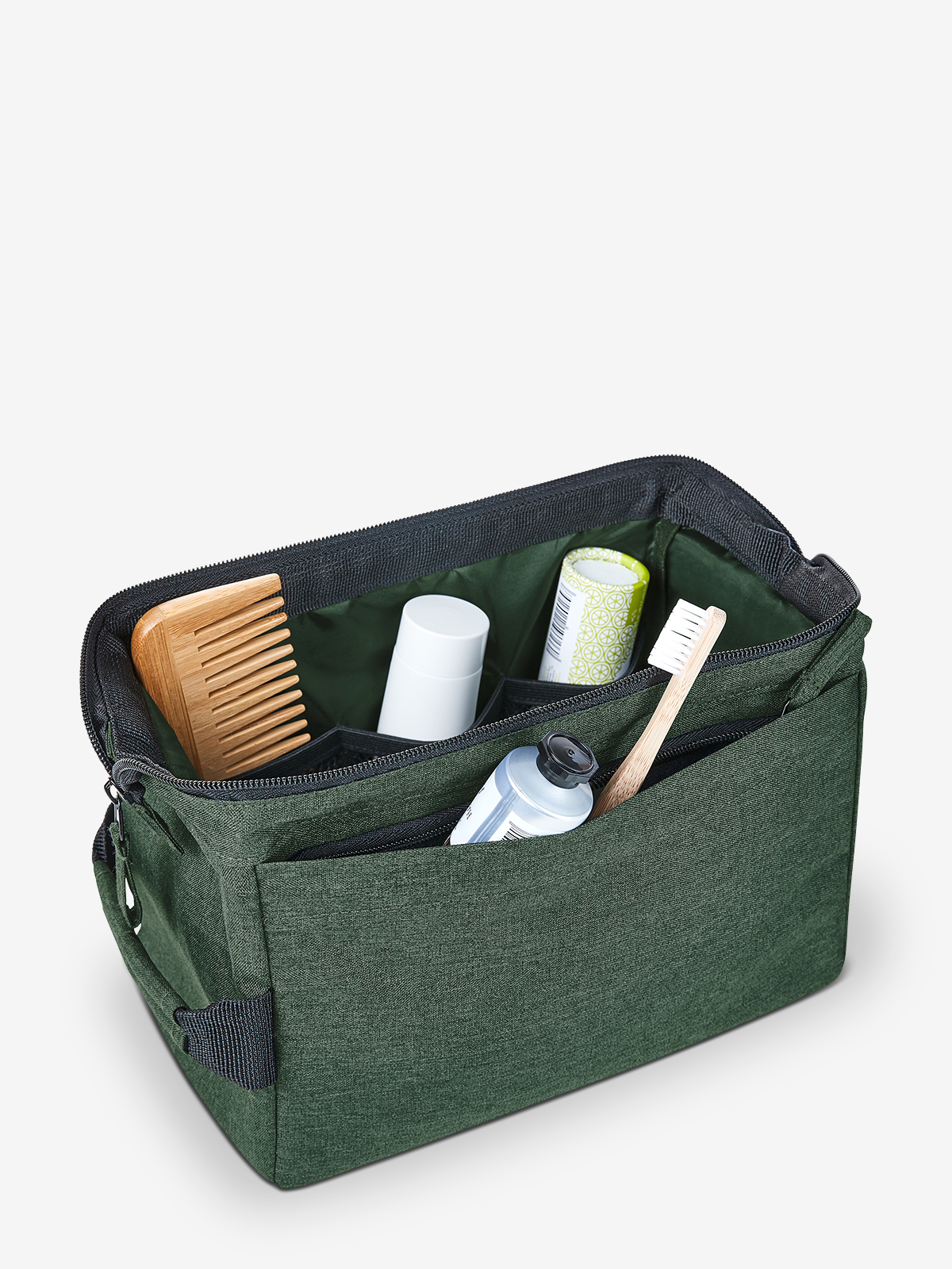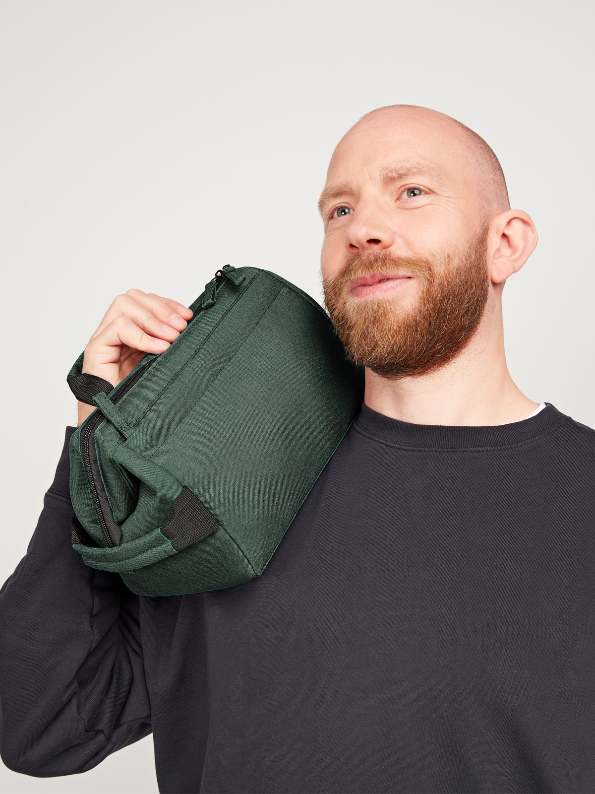formschöne Reißverschlusstasche mit stabiler Metallbügelöffnung zum Aufstellen oder -hängen; rPET-Obermaterial; großes, gepolstertes Hauptfach mit diversen Organizer-Elementen; Reißverschlussvortasche; Handgriff