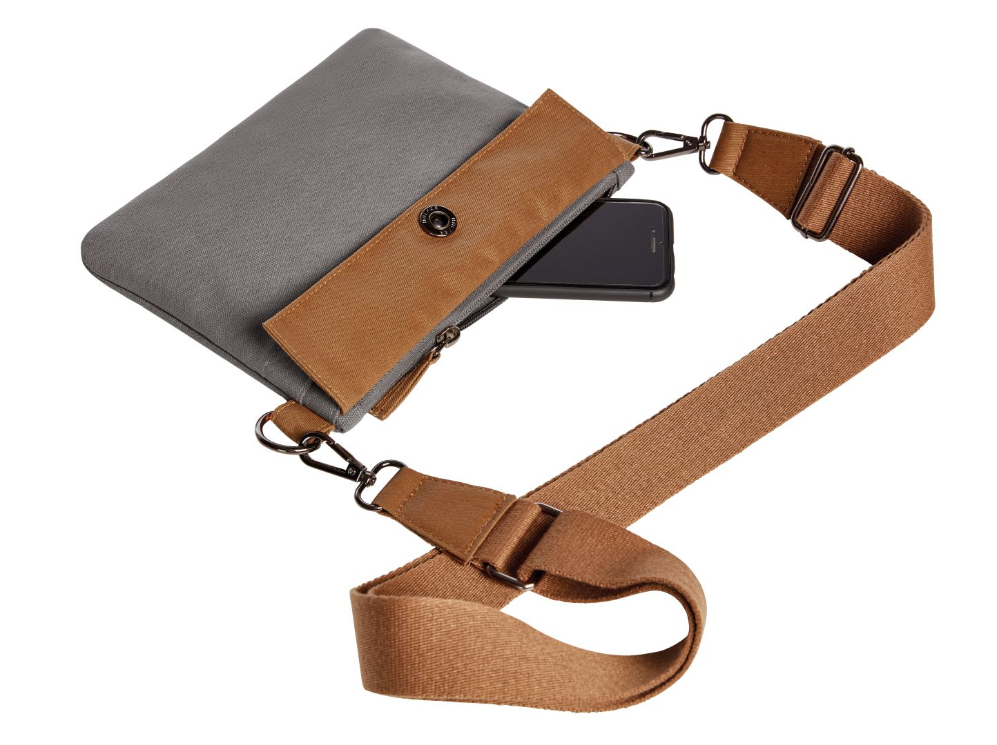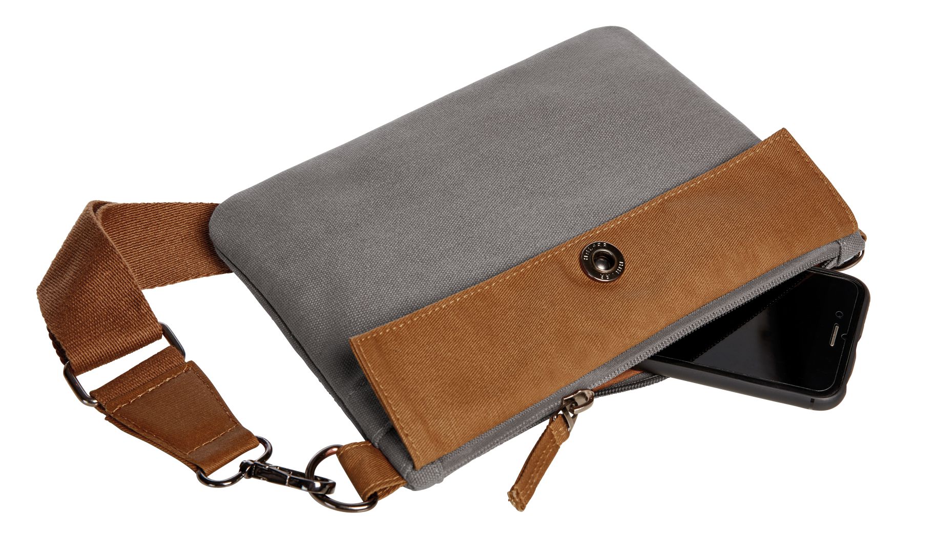 moderne, aufwändig verarbeitete Reißverschluss-Tasche; liebevoll gestaltet mit wertigen Metallaccessoires; Hauptfach mit Reißverschluss; Vortasche verschließbar mit Druckknopf; breiter, längenverstellbarer und abnehmbarer Baumwoll-Umhängegurt