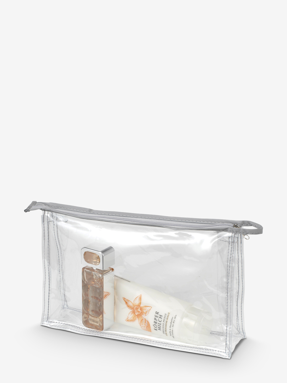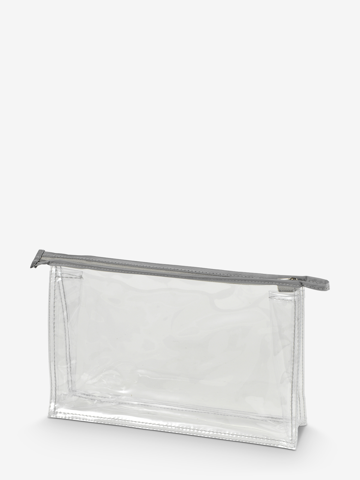 Wenn einer eine Reise tut... will er natürlich auf Kosmetika und seine Körperpflegeprodukte nicht verzichten. Ein passendes Behältnis dafür ist die stilvolle Reißverschluss-Tasche UNIVERSAL. Die Tasche ist 27 cm breit und bietet somit genügend Platz für Shampoo, Duschgel, Zahnbürste und was man sonst noch braucht, um gut auszusehen und sich frisch zu fühlen. Gefertigt wird sie aus strapazierfähiger Klarsichtfolie. Ein grauer Besatz verleiht der Tasche einen edlen Touch.