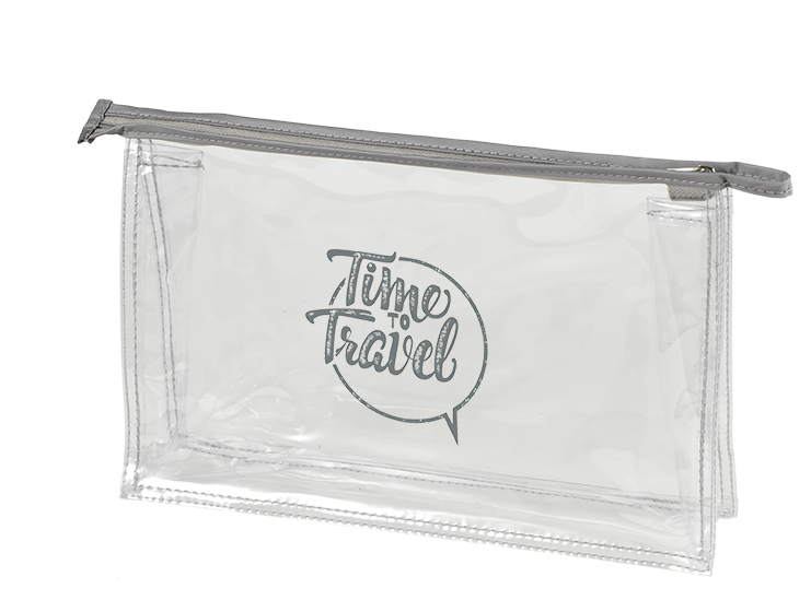 Wenn einer eine Reise tut... will er natürlich auf Kosmetika und seine Körperpflegeprodukte nicht verzichten. Ein passendes Behältnis dafür ist die stilvolle Reißverschluss-Tasche UNIVERSAL. Die Tasche ist 27 cm breit und bietet somit genügend Platz für Shampoo, Duschgel, Zahnbürste und was man sonst noch braucht, um gut auszusehen und sich frisch zu fühlen. Gefertigt wird sie aus strapazierfähiger Klarsichtfolie. Ein grauer Besatz verleiht der Tasche einen edlen Touch.