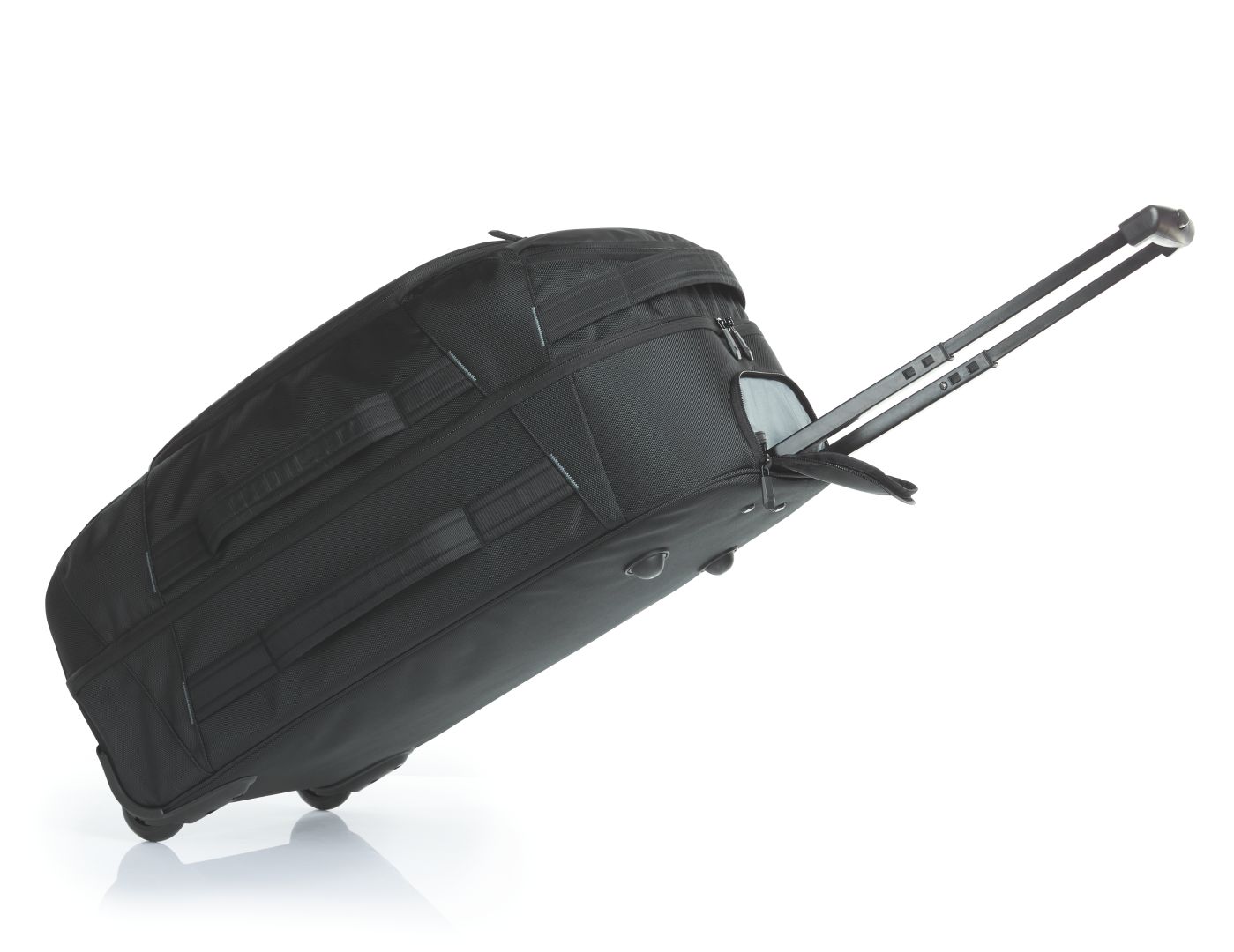 aufwendig gearbeitete Rollreisetasche mit Reflex-Besatz; Hauptfach mit dreiseitig umlaufendem 2-Wege-Reißverschluss; Hauptfach-Oberseite mit Reißverschluss-Trennwand; Hauptfach-Unterseite mit elastischem Packriemen; kleine Reißverschluss-Vortaschen mit farbigem Reißverschluss-Schieber; große Vortasche mit 2-Wege-Reißverschluss, gepolstertem, flachen Einsteckfach, zwei kleinen Einsteckfächern, großem Netz-Reißverschlussfach und elastischen Schlaufen; gepolsterte Tragegriffe; verstärkter Boden; Bodenfüße; Teleskopgriff; Leichtlaufrollen; Reißverschlusschieber verfügbar in den abgebildeten Farben