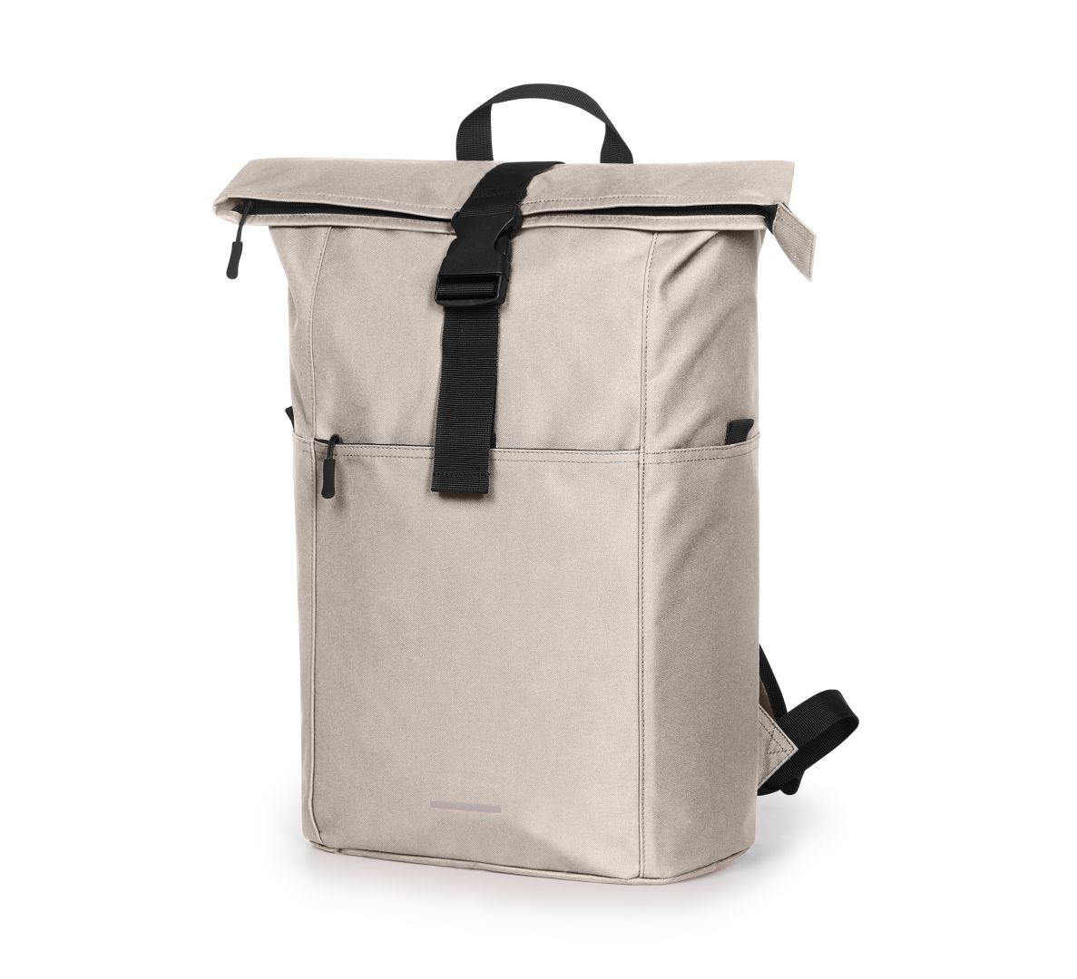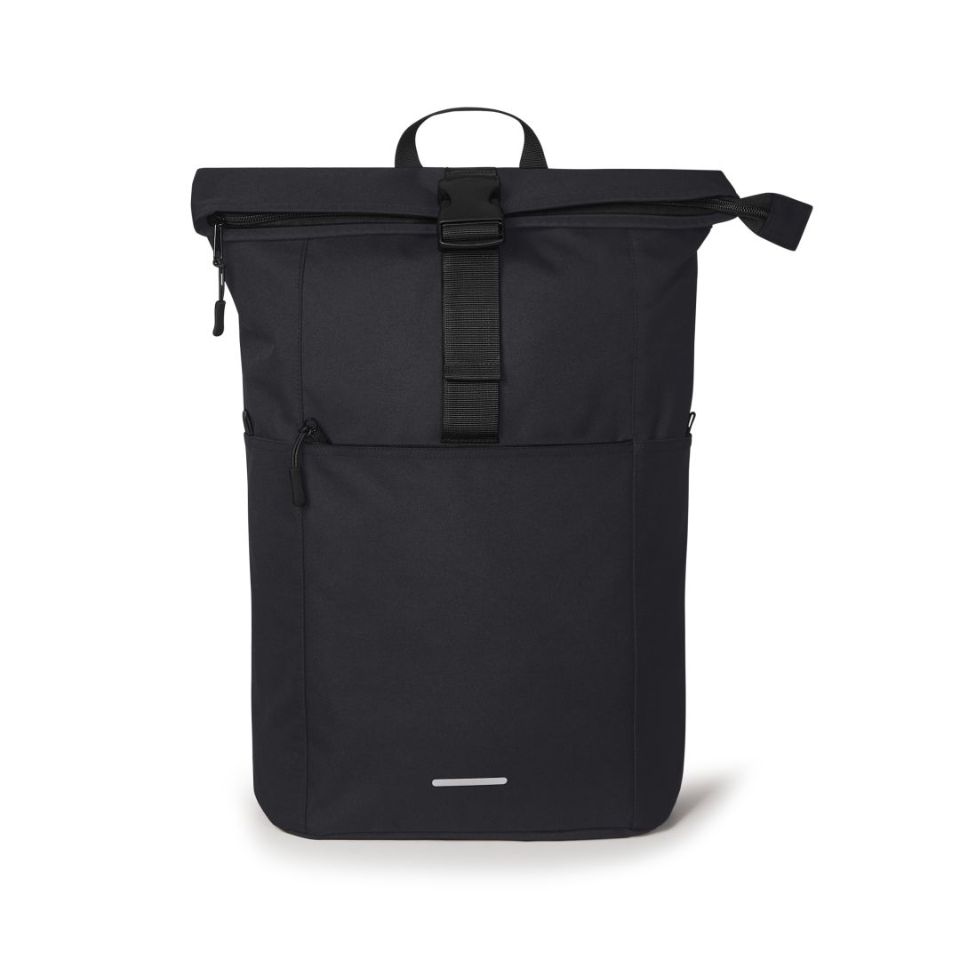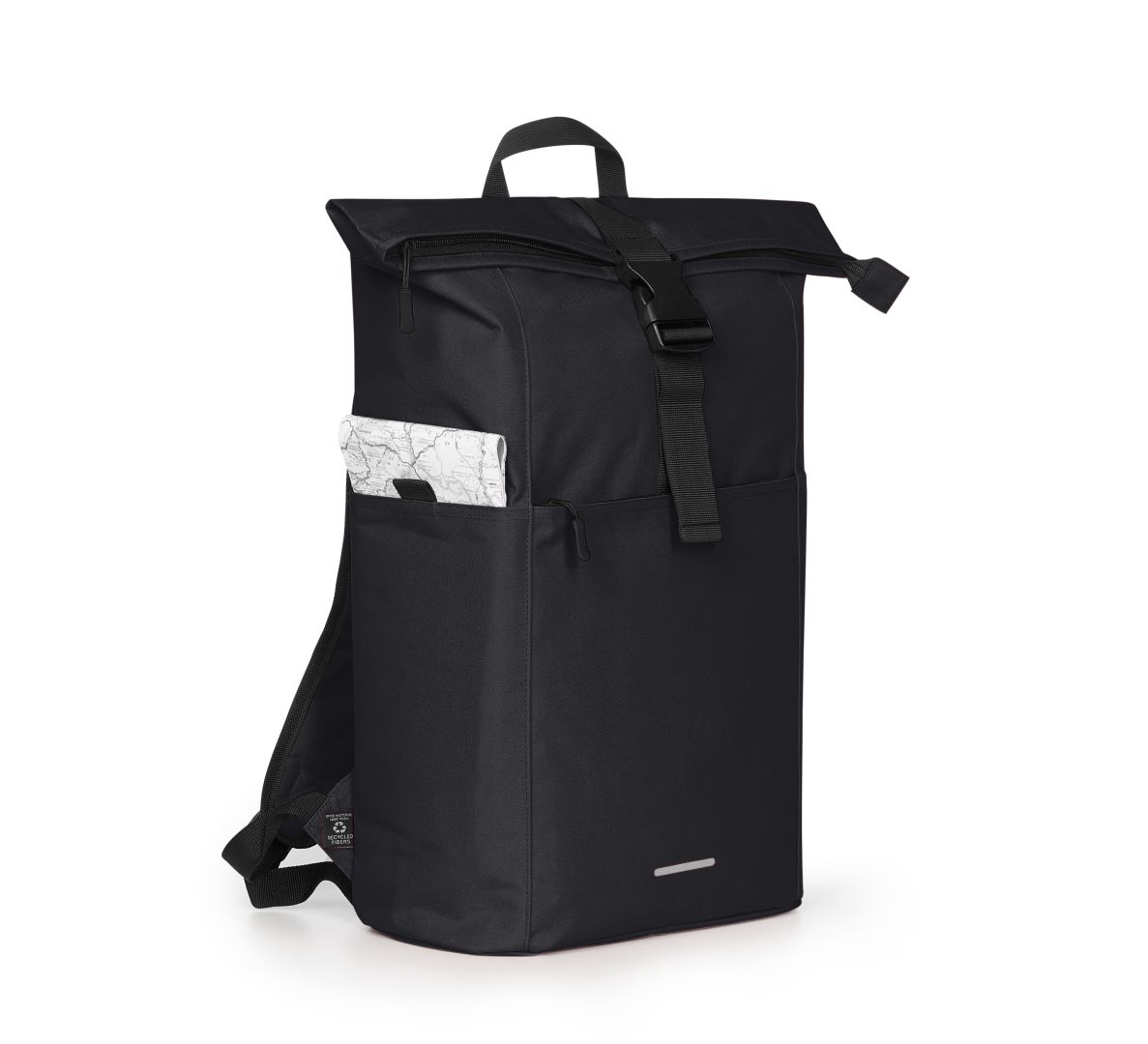 praktischer Roll-Top Rucksack; recycelter Oberstoff; großes Hauptfach mit Reißverschluss und zusätzlichem Steckverschluss; attraktiver Reflexdruck; RPT-Obermaterial; großes gepolstertes Einsteckfach; Airtag-Einsteckfach; große Reißverschluss-Vortasche auf der Front; zwei seitliche Einsteckfächer für z.B. Trinkflasche; gepolstertes Tragesystem; Handgriff