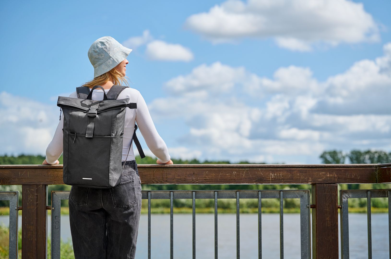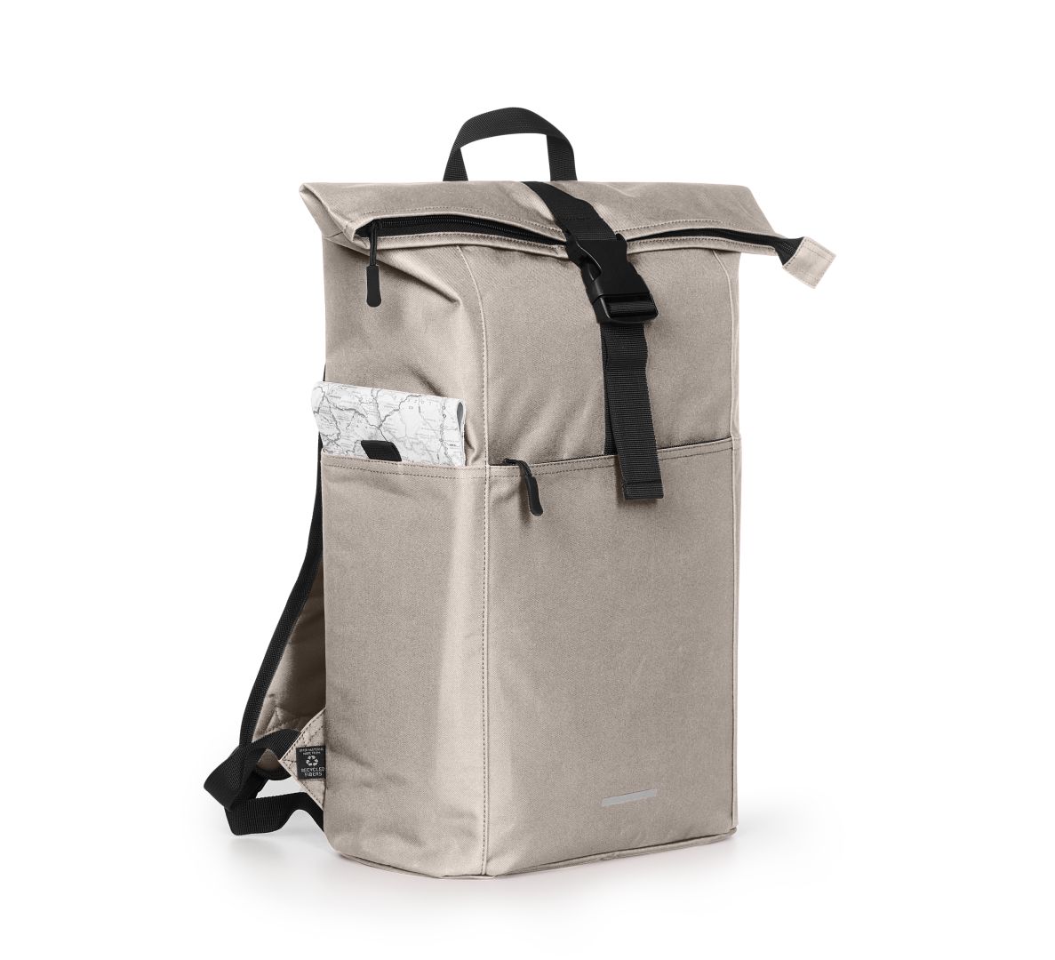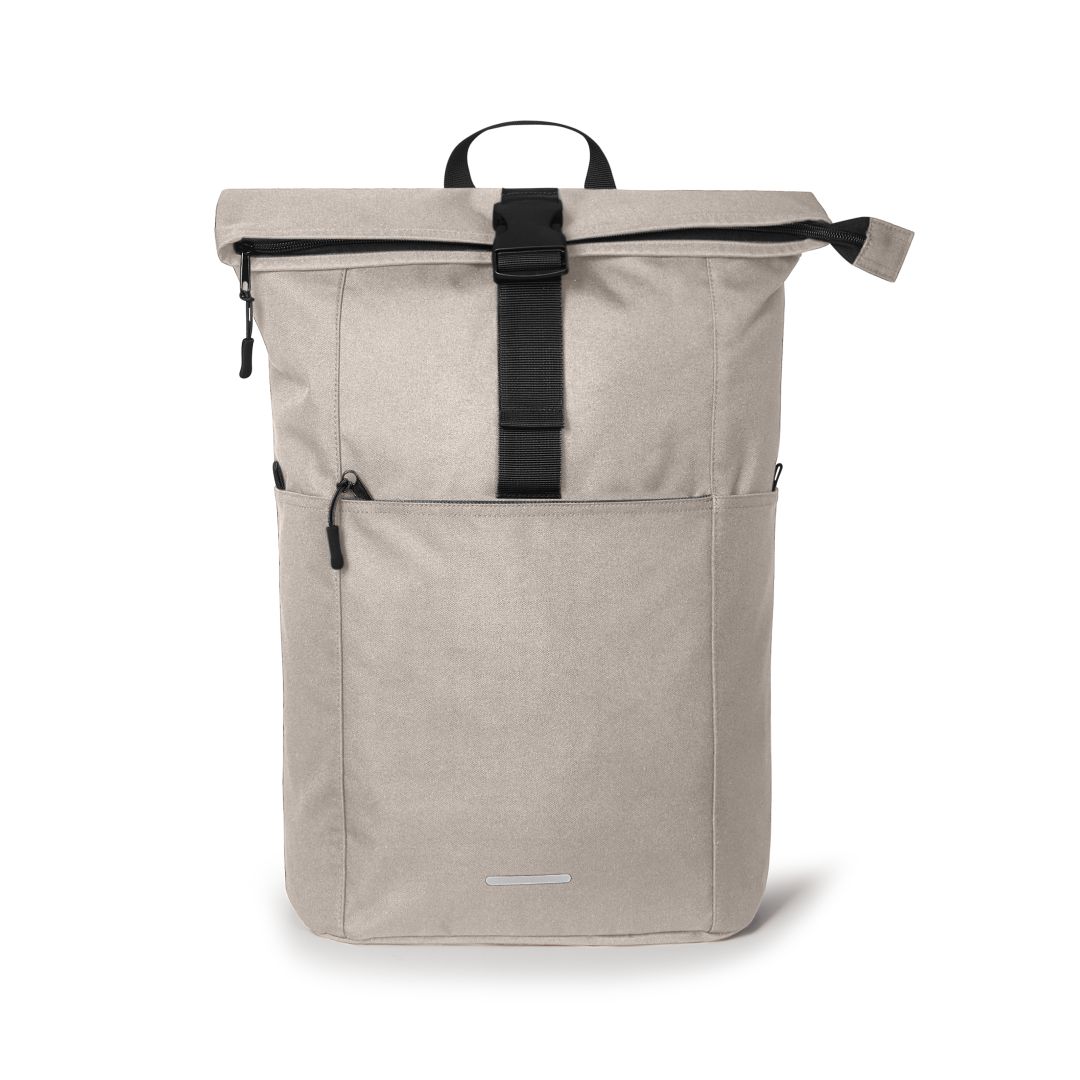 praktischer Roll-Top Rucksack; recycelter Oberstoff; großes Hauptfach mit Reißverschluss und zusätzlichem Steckverschluss; attraktiver Reflexdruck; RPT-Obermaterial; großes gepolstertes Einsteckfach; Airtag-Einsteckfach; große Reißverschluss-Vortasche auf der Front; zwei seitliche Einsteckfächer für z.B. Trinkflasche; gepolstertes Tragesystem; Handgriff