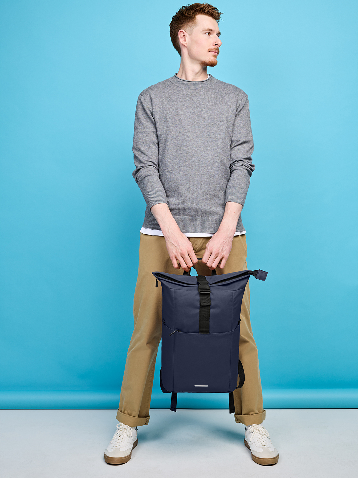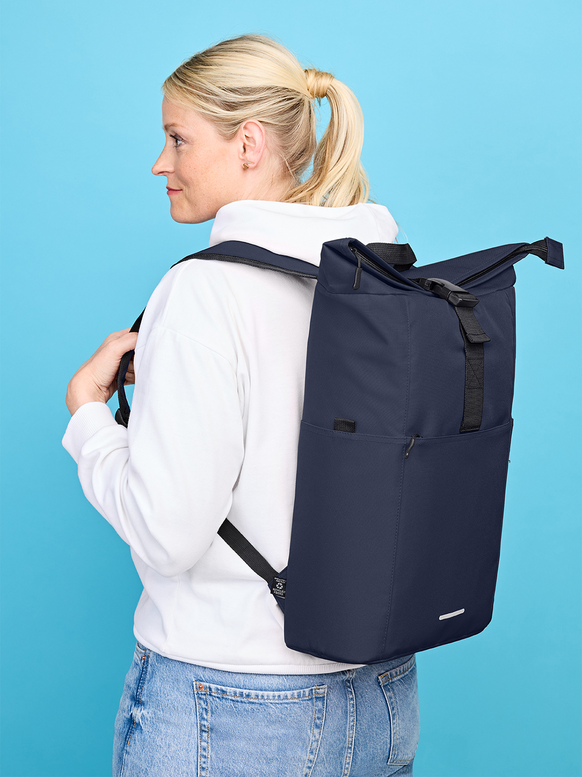 praktischer Roll-Top Rucksack; recycelter Oberstoff; großes Hauptfach mit Reißverschluss und zusätzlichem Steckverschluss; attraktiver Reflexdruck; RPT-Obermaterial; großes gepolstertes Einsteckfach; Airtag-Einsteckfach; große Reißverschluss-Vortasche auf der Front; zwei seitliche Einsteckfächer für z.B. Trinkflasche; gepolstertes Tragesystem; Handgriff