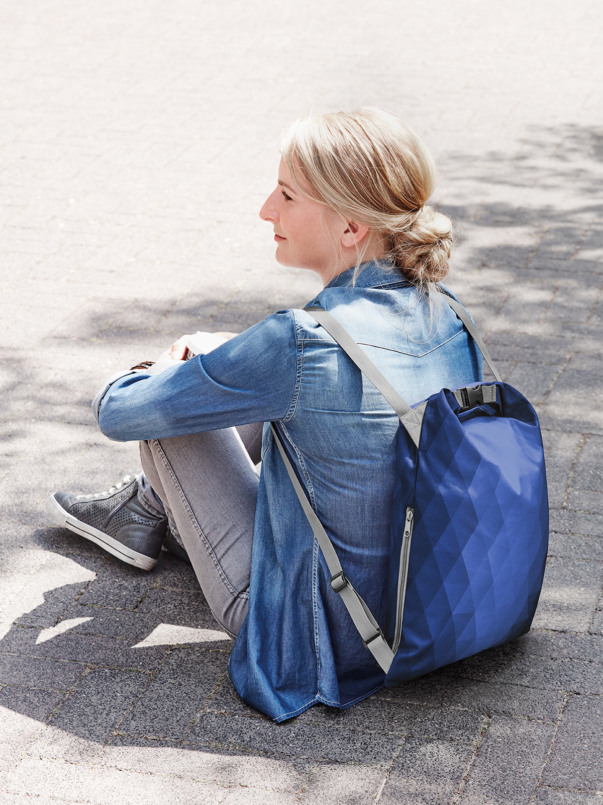 leichter, innovativer Rucksack mit Rauten-Dekor; beidseitig tragbar; Reißverschluss-Hauptfach mit zusätzlicher Wickelfunktion; seitliche Reißverschluss-Tasche; gewebte, längenverstellbare Schultergurte