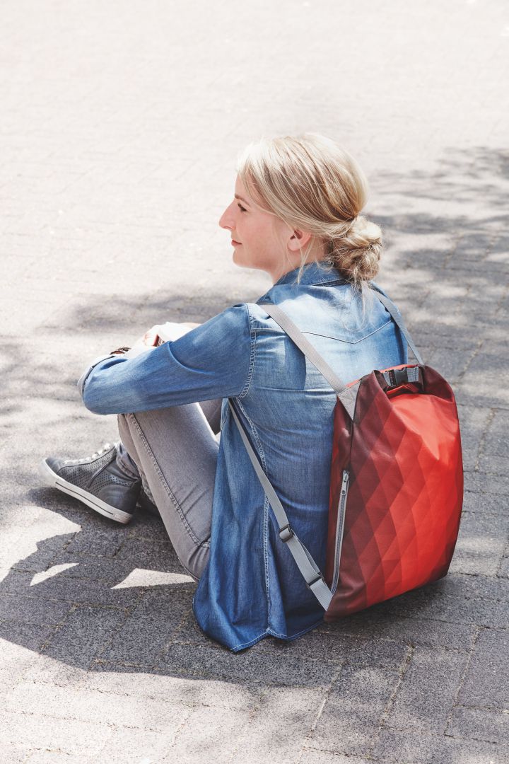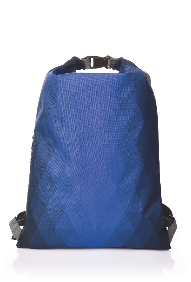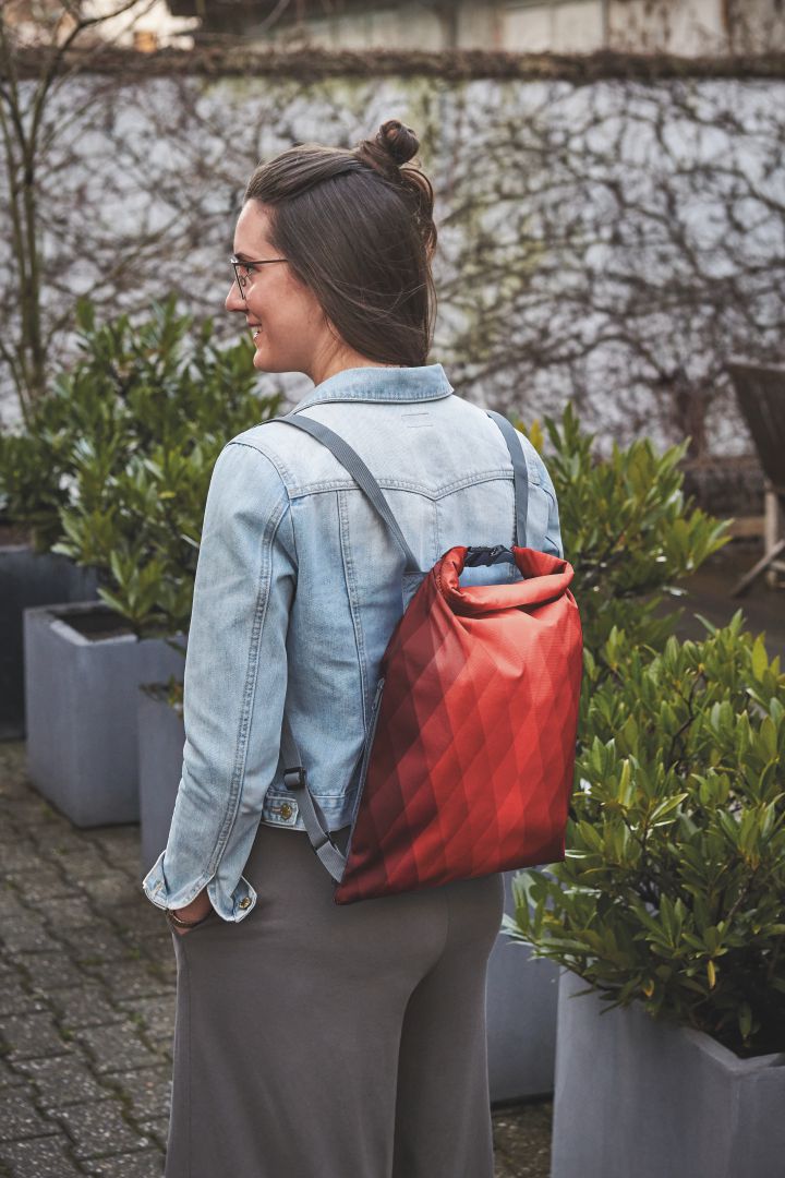 leichter, innovativer Rucksack mit Rauten-Dekor; beidseitig tragbar; Reißverschluss-Hauptfach mit zusätzlicher Wickelfunktion; seitliche Reißverschluss-Tasche; gewebte, längenverstellbare Schultergurte