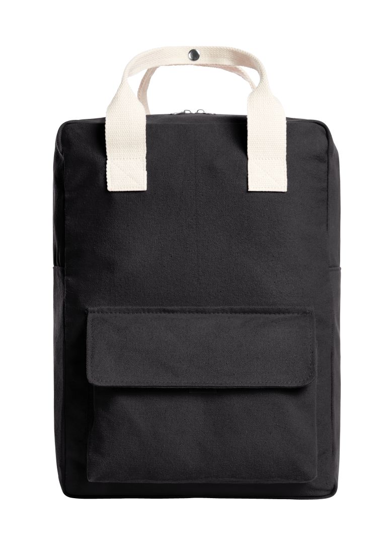 urbaner Rucksack mit wertigen Metall-Accessoires; Hauptfach mit 2-Wege-Reißverschluss; flaches Einsteckfach innen; Vortasche mit Klettverschluss; Handgriffe mit Druckknopf; längenverstellbarer Baumwoll-Träger