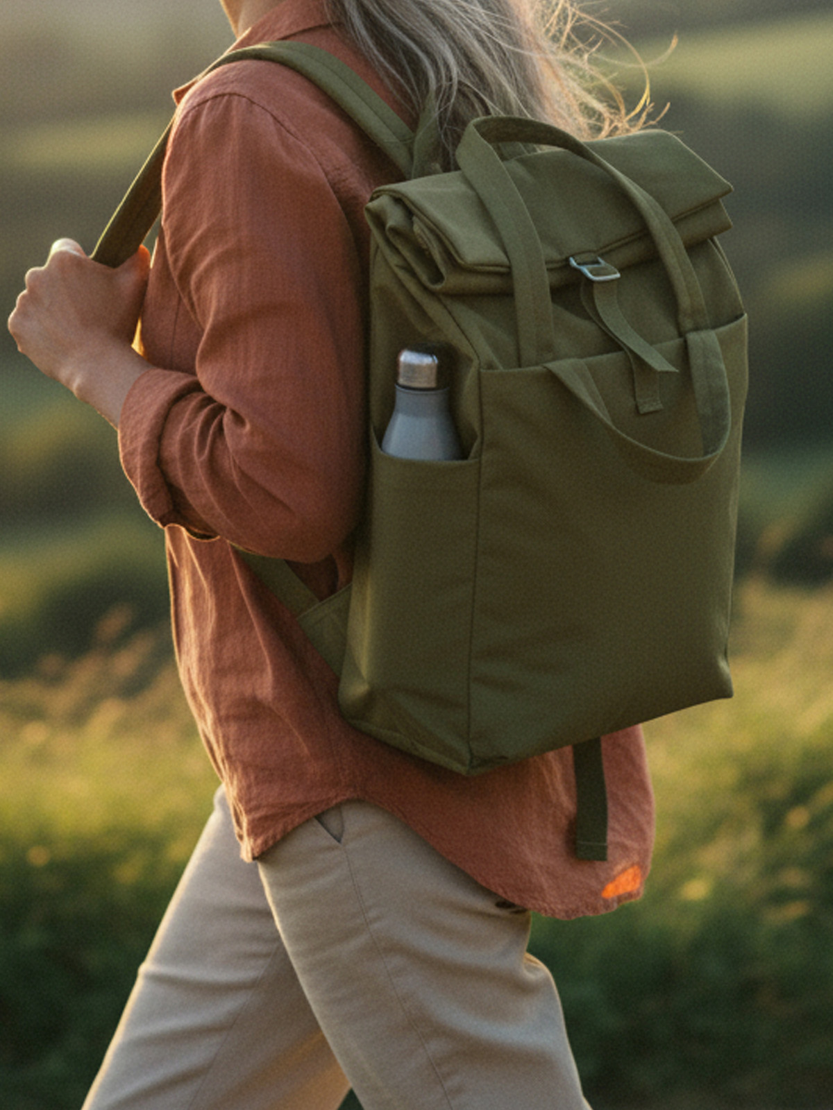 attraktiver Freizeitrucksack mit Wickelverschluss, hochwertiger Metallschließe und genähten Handgriffen; Volumenerweiterung; Hauptfach mit gepolstertem Gerätefach; große Reißverschluss-Vortasche; zwei seitliche Einsteckfächer; großes Reißverschluss-Seitenfach rückseitig; gut gepolstertes Tragesystem