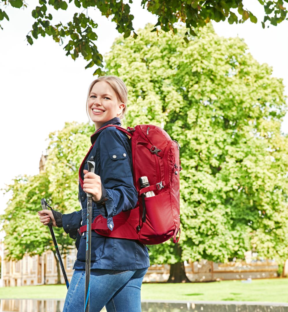 Ausflug in die Abruzzen, Wandern am Wendelstein oder Trekking im Teutoburger Wald? Auf die Frage nach dem Wohin, folgt schnell die nach dem Was. Wer gerne längere und mehrtägige Wandertouren macht, weiß, dass die Ausrüstung einiges ausmacht. Mit dem leichten, funktionellen Rucksack OUTDOOR haben wir einen echten Spezialisten im Programm. Das innovative Wabensystem am ergonomisch geformten Rücken sorgt für angenehme Polsterung und Belüftung. An Schulter-, Brust- oder Beckengurt lässt sich das Tragesystem individuell einstellen. Für Trinkblase mit Schlauch, Wanderstöcke oder Kopfhörer gibt es eigene Befestigungen und Auslässe. Im Bodenfach steckt eine Regenhülle. Und zahlreiche Fächer sortieren den Inhalt bestens - los geht's!