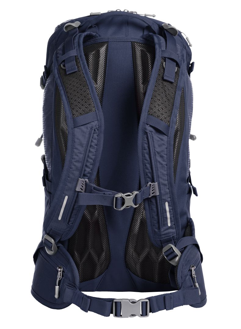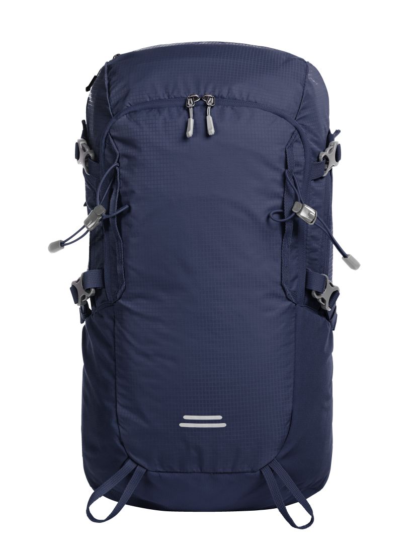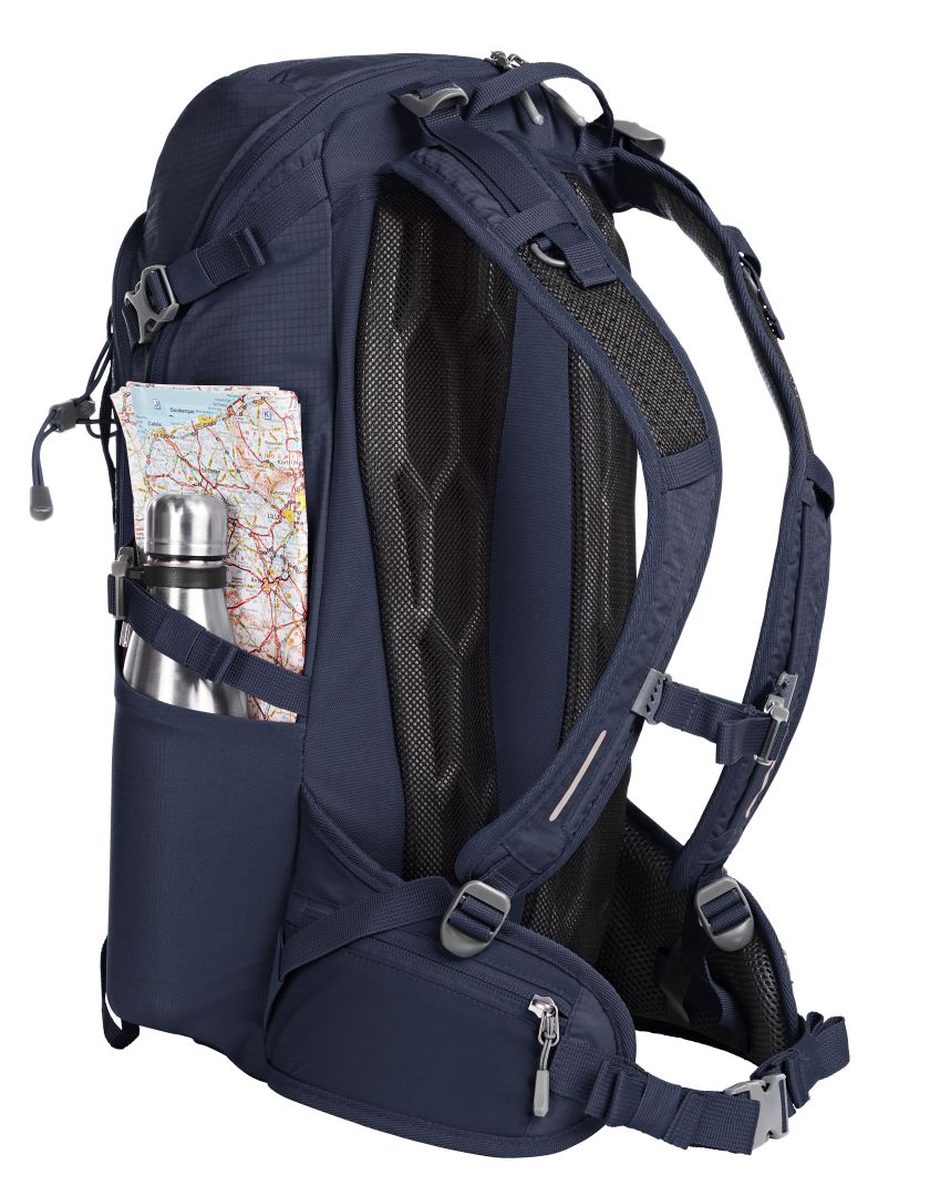 leichter, funktioneller Rucksack mit ergonomisch geformtem Rücken und innovativem Wabensystem für ideale Belüftung und Polsterung, oben wie unten höhenverstellbar für eine perfekte Passform; höhenverstellbarer Brustgurt; gepolsterter Beckengurt mit Reißverschlusstaschen; großes 2-Wege-Reißverschluss-Hauptfach mit flachem Einsteckfach innen; rückseitiger Ausgang geeignet für z.B. Kopfhörer oder Schlauch des zusätzlich lieferbarem Trinksystems (Artikel 1812216); Klettloop zur Fixierung des Trinkschlauches; 2 Reißverschlussvortaschen; 2 Netz-Seitentaschen; seitliche Zurrgurte; funktionales Schlaufenband auf der Fronttasche; dekorativer Reflex-Aufdruck; Wanderstockfixierungen; Bodenfach mit Regenhülle; Handgriff
