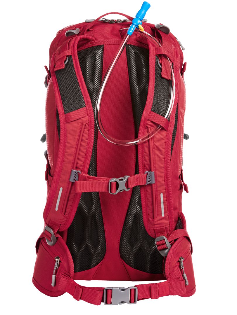 leichter, funktioneller Rucksack mit ergonomisch geformtem Rücken und innovativem Wabensystem für ideale Belüftung und Polsterung, oben wie unten höhenverstellbar für eine perfekte Passform; höhenverstellbarer Brustgurt; gepolsterter Beckengurt mit Reißverschlusstaschen; großes 2-Wege-Reißverschluss-Hauptfach mit flachem Einsteckfach innen; rückseitiger Ausgang geeignet für z.B. Kopfhörer oder Schlauch des zusätzlich lieferbarem Trinksystems (Artikel 1812216); Klettloop zur Fixierung des Trinkschlauches; 2 Reißverschlussvortaschen; 2 Netz-Seitentaschen; seitliche Zurrgurte; funktionales Schlaufenband auf der Fronttasche; dekorativer Reflex-Aufdruck; Wanderstockfixierungen; Bodenfach mit Regenhülle; Handgriff