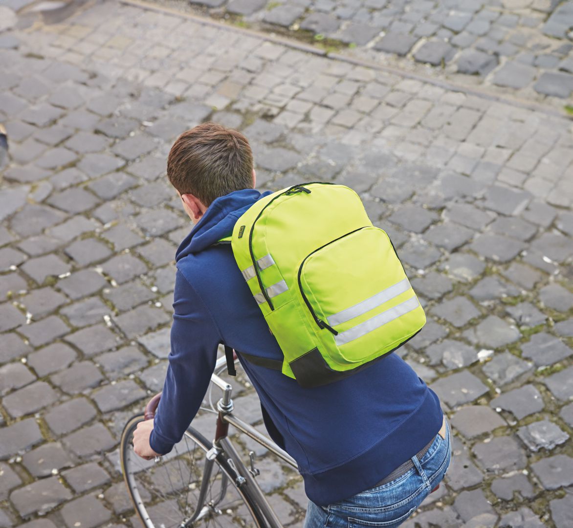 Folgen Sie diesem Rucksack – die gute alte Aufforderung zur Verfolgung, bekannt aus vielen Krimis, wird mit dem Rucksack REFLEX sicher von Erfolg gekrönt. Denn diese Tasche ist kaum zu übersehen. Da leuchtet einfach alles: das neongelbe Polyester 900 D strahlt schon von alleine. Erst recht aber die Reflexstreifen aus Original Scotchlite 3M. Ein Vorteil nicht nur für den Verfolger. Im Gegenteil: Wer den REFLEX auf dem Rücken trägt, taugt als leuchtendes Vorbild. Ideal für alle, die gerne draußen unterwegs sind, vom Radfahrer bis zum Spaziergänger. Und für jene, die mit Neon auch modisch voranpreschen wollen.