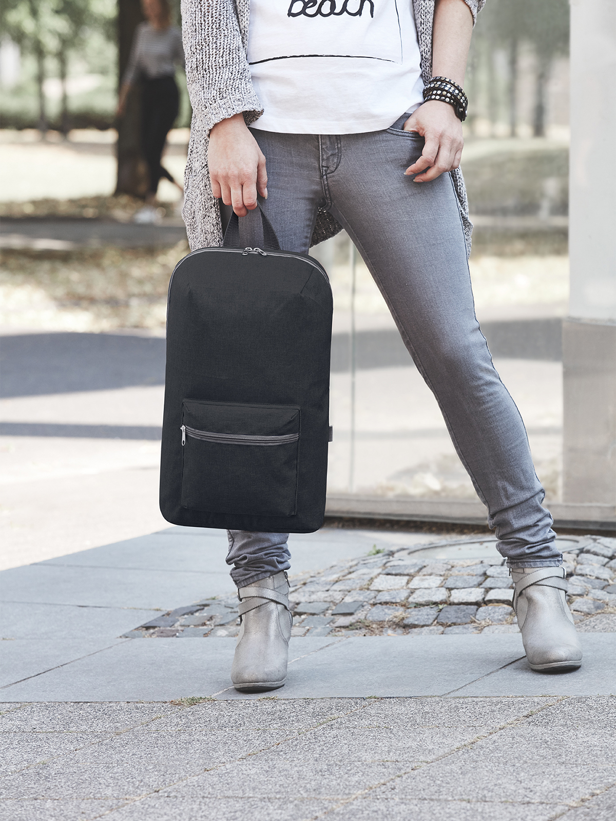 leichter Rucksack; Hauptfach mit 2-Wege-Reißverschluss; Reißverschluss-Vortasche; Reißverschluss-Innentasche; längenverstellbares, atmungsaktives Tragesystem; Handgriff; Falt- und Verstaufunktion
