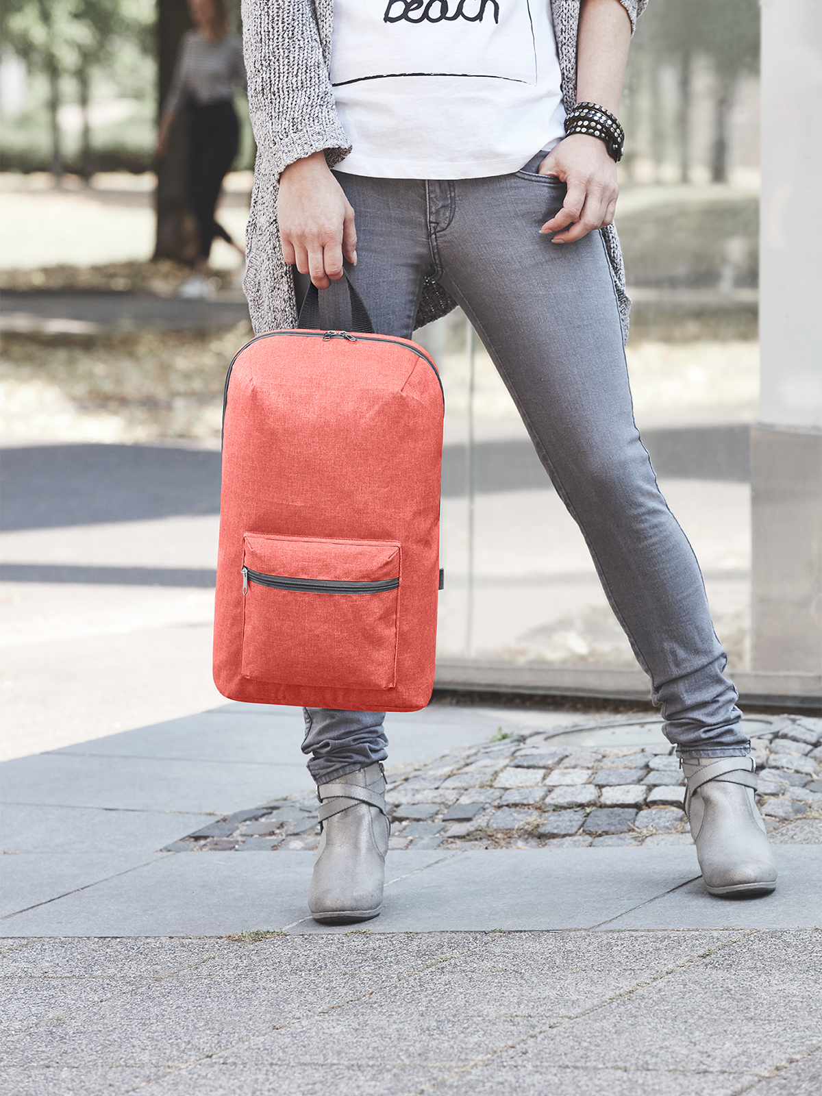 leichter Rucksack; Hauptfach mit 2-Wege-Reißverschluss; Reißverschluss-Vortasche; Reißverschluss-Innentasche; längenverstellbares, atmungsaktives Tragesystem; Handgriff; Falt- und Verstaufunktion