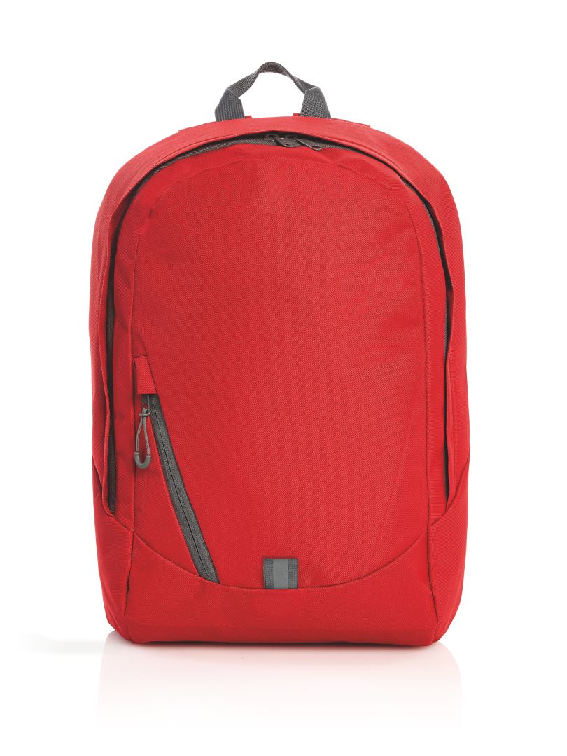 moderner Rucksack mit Reißverschluss-Vortasche; Hauptfach mit 2-Wege-Reißverschluss und flachem Einsteckfach innen; Regenklappe; Reflektor-Streifen vorne, Rücken und Schultergurte gepolstert; Handgriff