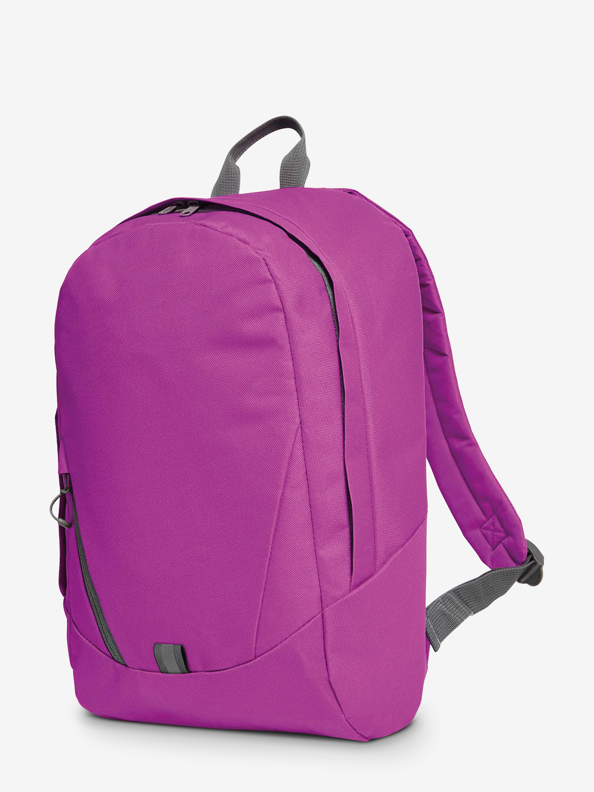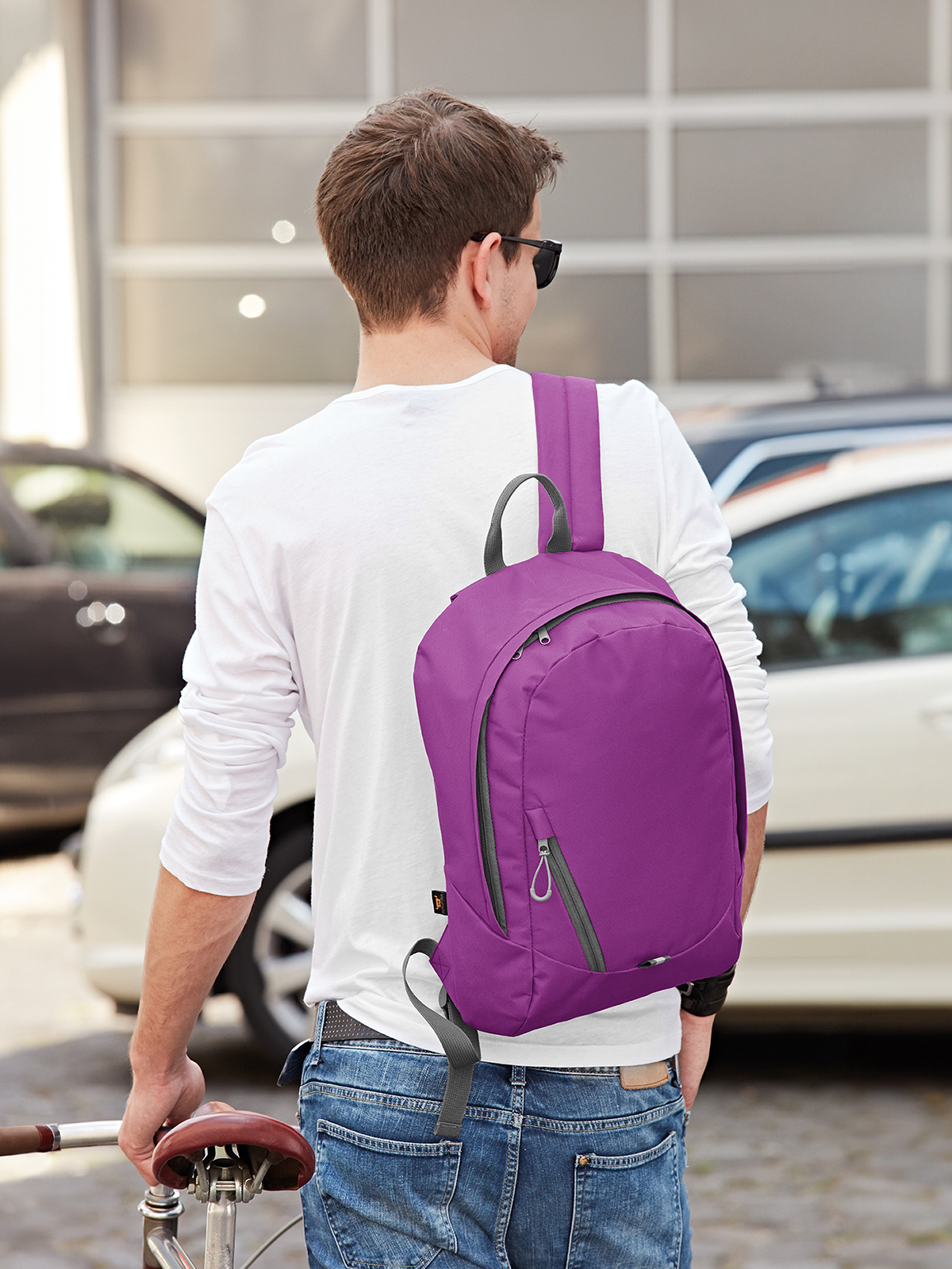 moderner Rucksack mit Reißverschluss-Vortasche; Hauptfach mit 2-Wege-Reißverschluss und flachem Einsteckfach innen; Regenklappe; Reflektor-Streifen vorne, Rücken und Schultergurte gepolstert; Handgriff