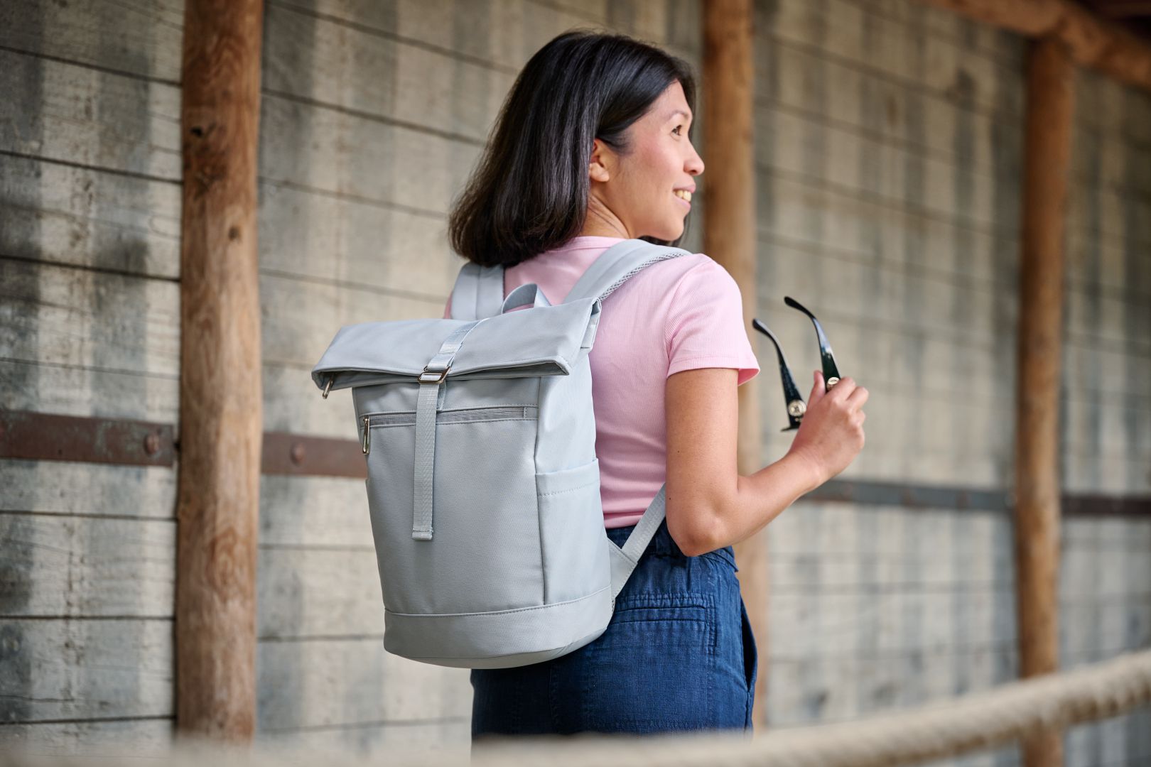 Klein ist relativ. Dieser Rucksack wird nur im Vergleich zu seinem Serienpartner zur S-Version. Allein betrachtet ist er nicht wirklich small, sondern ein vollwertiger Rucksack, der für viele Alltagssituationen genau richtig ist. Zum Lieblingsbegleiter macht ihn als erstes sein sehr gefälliges textiles Material, das ein wahrer Handschmeichler ist. Durch die Ton-in-Ton Farbgebung wird er außerdem zur Augenweide. Hier passt farblich einfach alles zusammen, von Reißverschlüssen, über Gurte bis zur Trolleyschlaufe und zum Netzgewebe am Rücken. Nur innen glänzt zur besseren Orientierung helles Kontrastfutter. Dort findet sich auch ein gepolstertes Fach, groß genug für kleine Laptops oder Tablets. Und wenn es doch einmal Größeres zu transportieren gibt, hat der STAR S nach oben noch genug Kapazitäten. Ansonsten hält die schöne Metallschließe alles aufs gewünschte Packmaß zusammen.