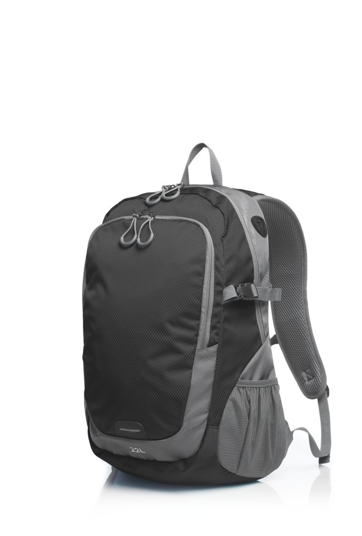 geräumiges Hauptfach mit 2-Wege-Reißverschluss und Einsteckfach innen; seitliche Zurrgurte; Reißverschluss-Vortasche mit zwei Einsteckfächern; Reflektor-Streifen vorne; seitliche Netzfächer; Kopfhörerausgang; gepolsterte Schultergurte mit höhenverstellbarem, dehnbarem Brustgurt; gepolsterter Rücken