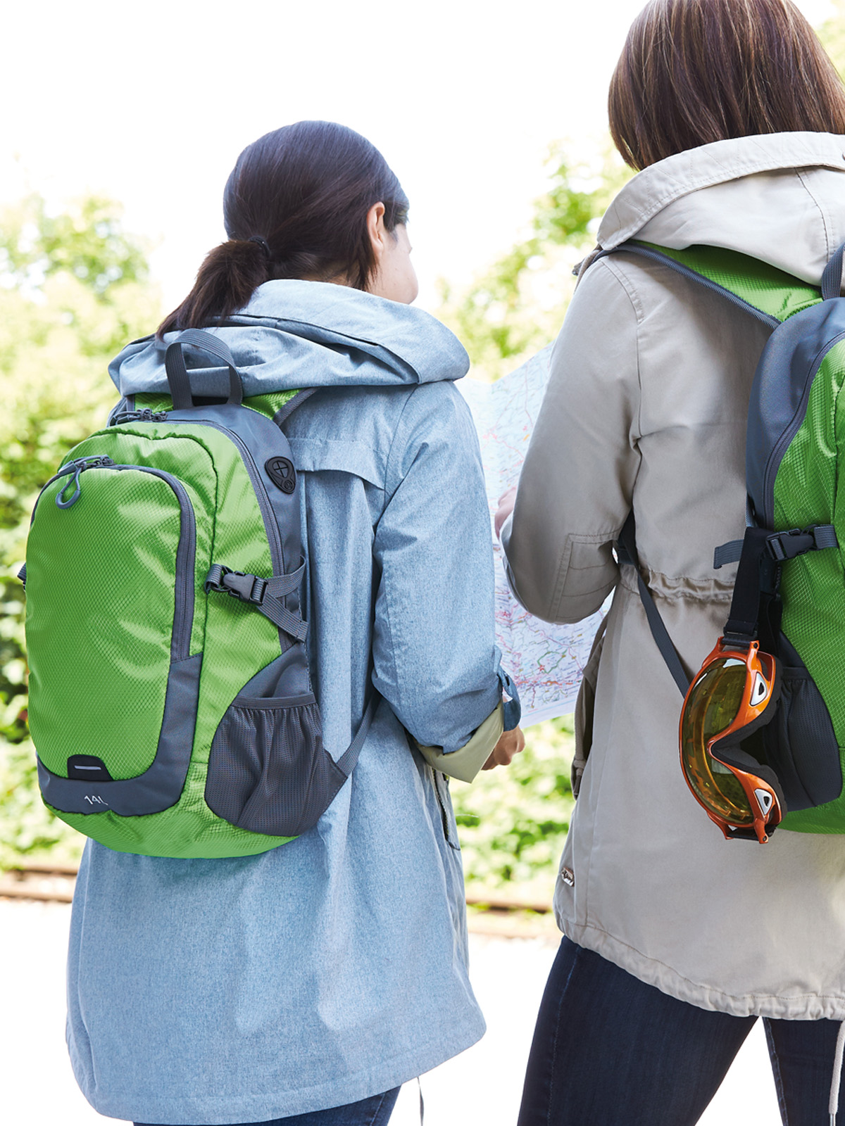 geräumiges Hauptfach mit 2-Wege-Reißverschluss und Einsteckfach innen; seitliche Zurrgurte; Reißverschluss-Vortasche mit zwei Einsteckfächern; Reflektor-Streifen vorne; seitliche Netzfächer; Kopfhörerausgang; gepolsterte Schultergurte mit höhenverstellbarem, dehnbarem Brustgurt; gepolsterter Rücken
