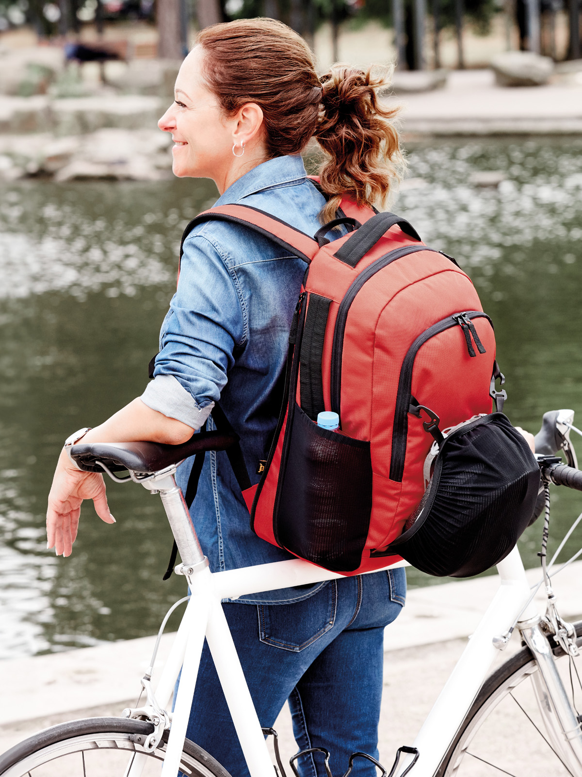 klassisches Multitalent für die Freizeit; großes Hauptfach mit 2-Wege-Reißverschluss; flaches Einsteckfach; Volumenerweiterung; 2-Wege-Reißverschluss-Vortasche; Bodenfach mit versenkbarem Netz; elastische Netzseitentaschen; zwei Handgriffe; Tragelasche; verstellbarer Brustgurt; gepolstertes, längenverstellbares Tragesystem