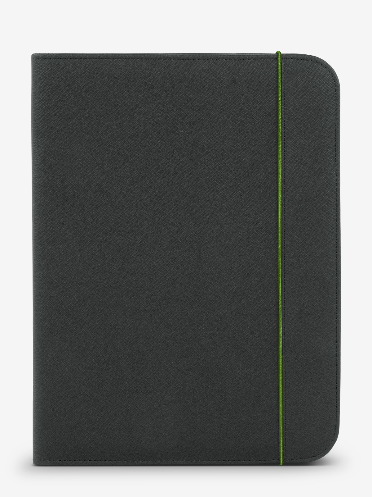 schwarze Schreibmappe mit Organizer-Elementen; verschließbar mit farbigem Gummiband; inkl. Schreibblock; flaches Einsteckfach; Gummischlaufe für Kugelschreiber