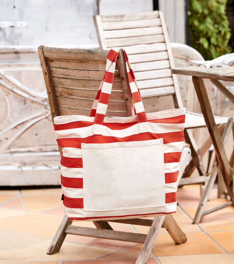 sehr großer Baumwoll-Shopper schwerer Qualität; großzügiger Schnitt mit großer Vortasche; Klettverschluss; frisches Blockstreifen-Dekor