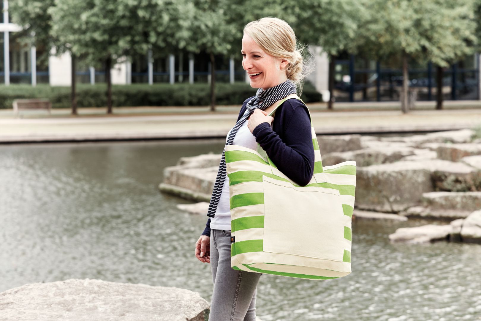 sehr großer Baumwoll-Shopper schwerer Qualität; großzügiger Schnitt mit großer Vortasche; Klettverschluss; frisches Blockstreifen-Dekor