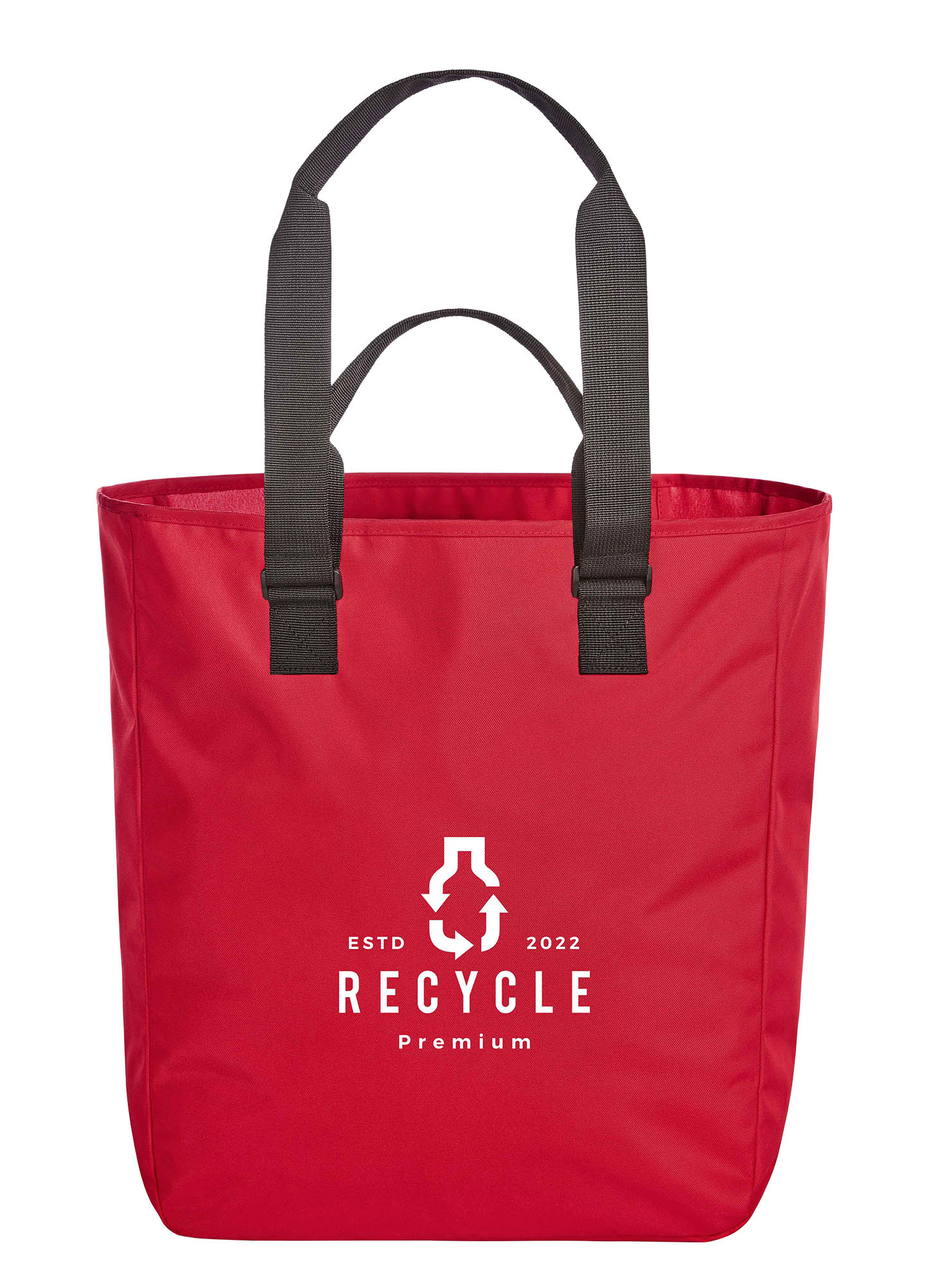 formschöner, großer Shopper; RPET-Obermaterial; Hauptfach mit hängendem Reißverschluss-Organizer; Tragesystem mit Doppelgriffen und dekorativer Schnalle
