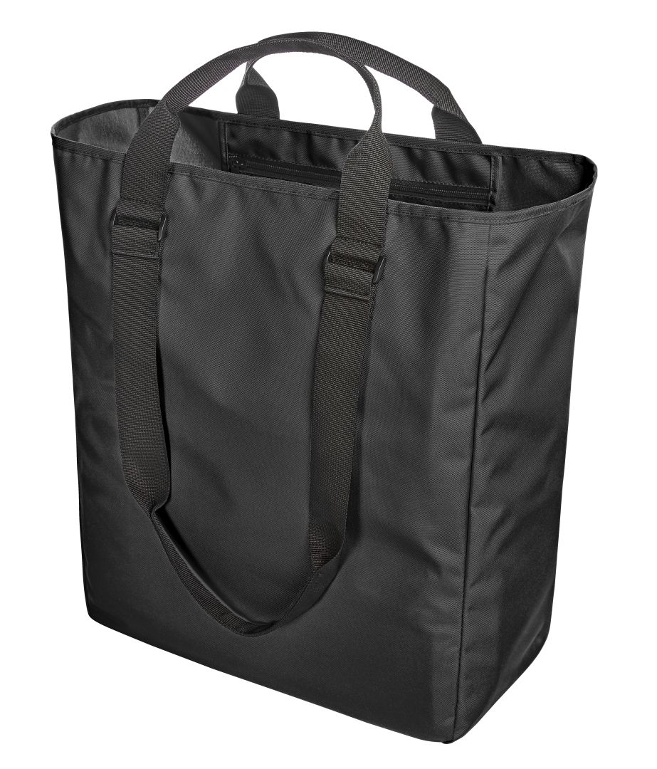 formschöner, großer Shopper; RPET-Obermaterial; Hauptfach mit hängendem Reißverschluss-Organizer; Tragesystem mit Doppelgriffen und dekorativer Schnalle