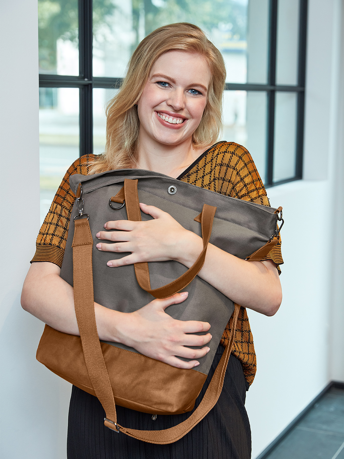 moderner, aufwändig verarbeiteter Shopper; liebevoll gestaltet mit wertigen Metall-Accessoires und beschichteten Baumwoll-Besätzen; großes Hauptfach verschließbar mit Reißverschluss und Druckknopf; hängende Reißverschluss-Innentasche; seitlich von außen zugängliche Reißverschluss-Tasche; lange Tragegriffe; längenverstellbarer, abnehmbarer Baumwoll-Schultergurt