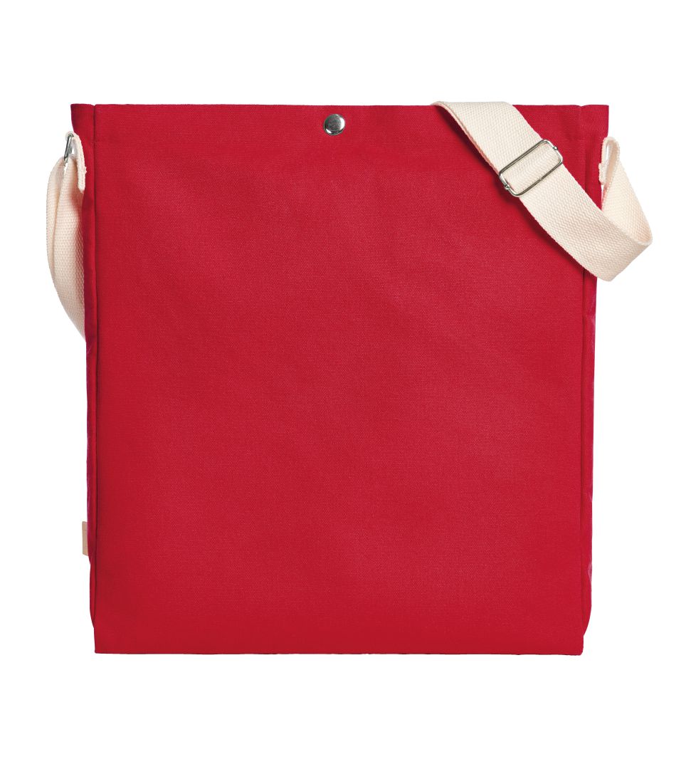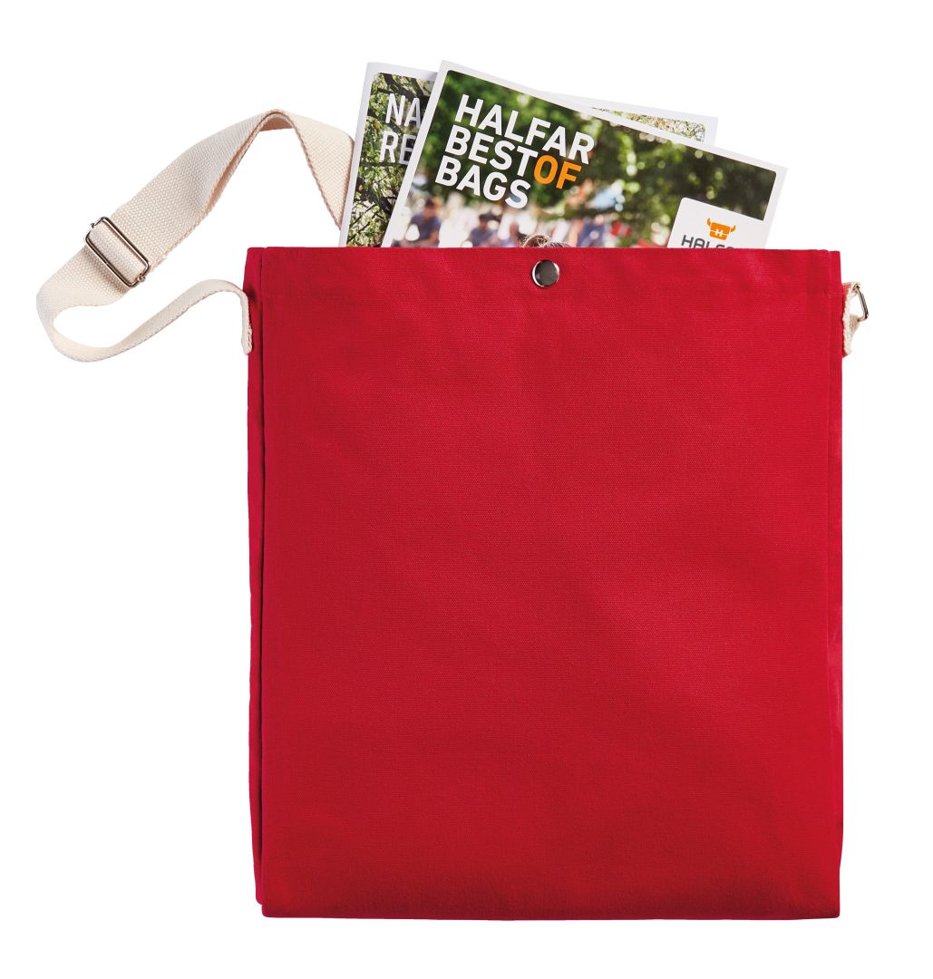 gradliniger Shopper mit großer Werbefläche; geräumiges Hauptfach - ideal geeignet für Kataloge und DIN A4-Unterlagen, mit Druckknopf verschließbar; breiter, längenverstellbarer Baumwoll-Schultergurt