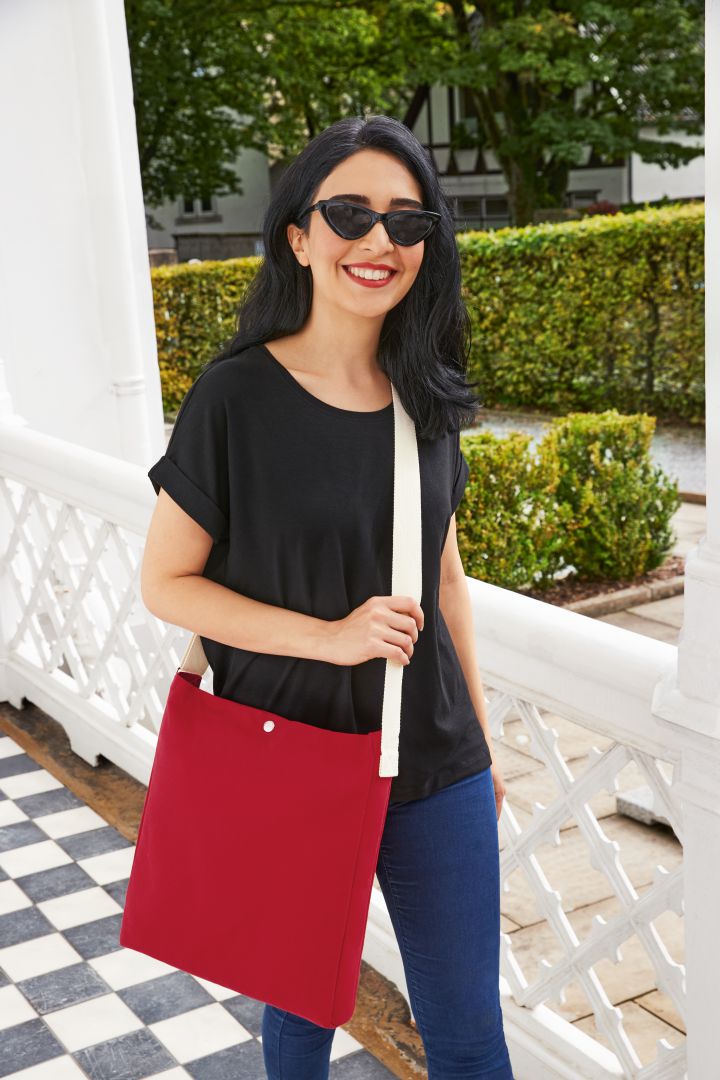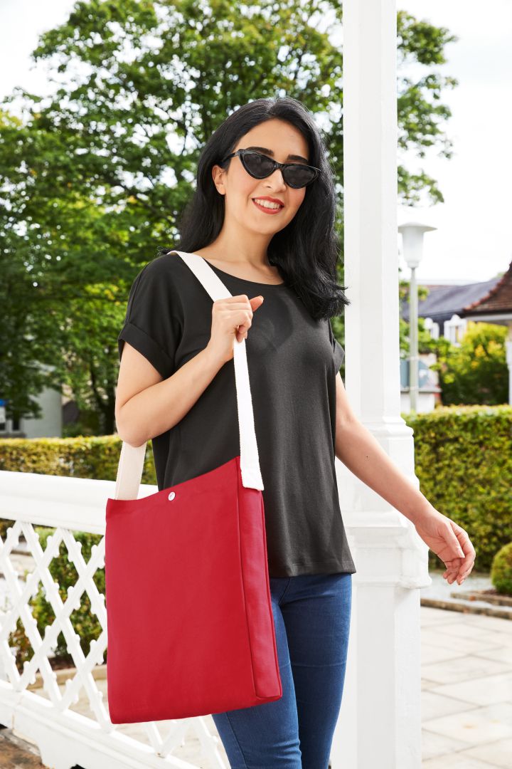 gradliniger Shopper mit großer Werbefläche; geräumiges Hauptfach - ideal geeignet für Kataloge und DIN A4-Unterlagen, mit Druckknopf verschließbar; breiter, längenverstellbarer Baumwoll-Schultergurt