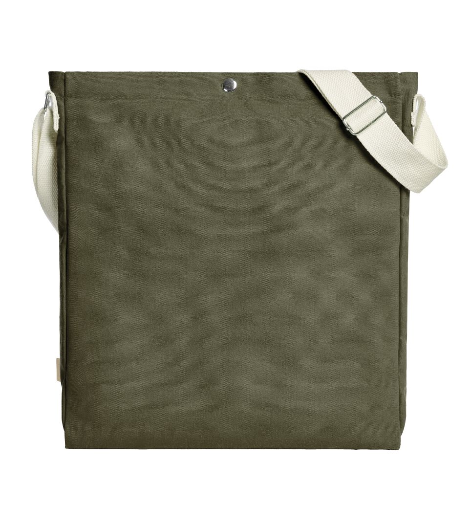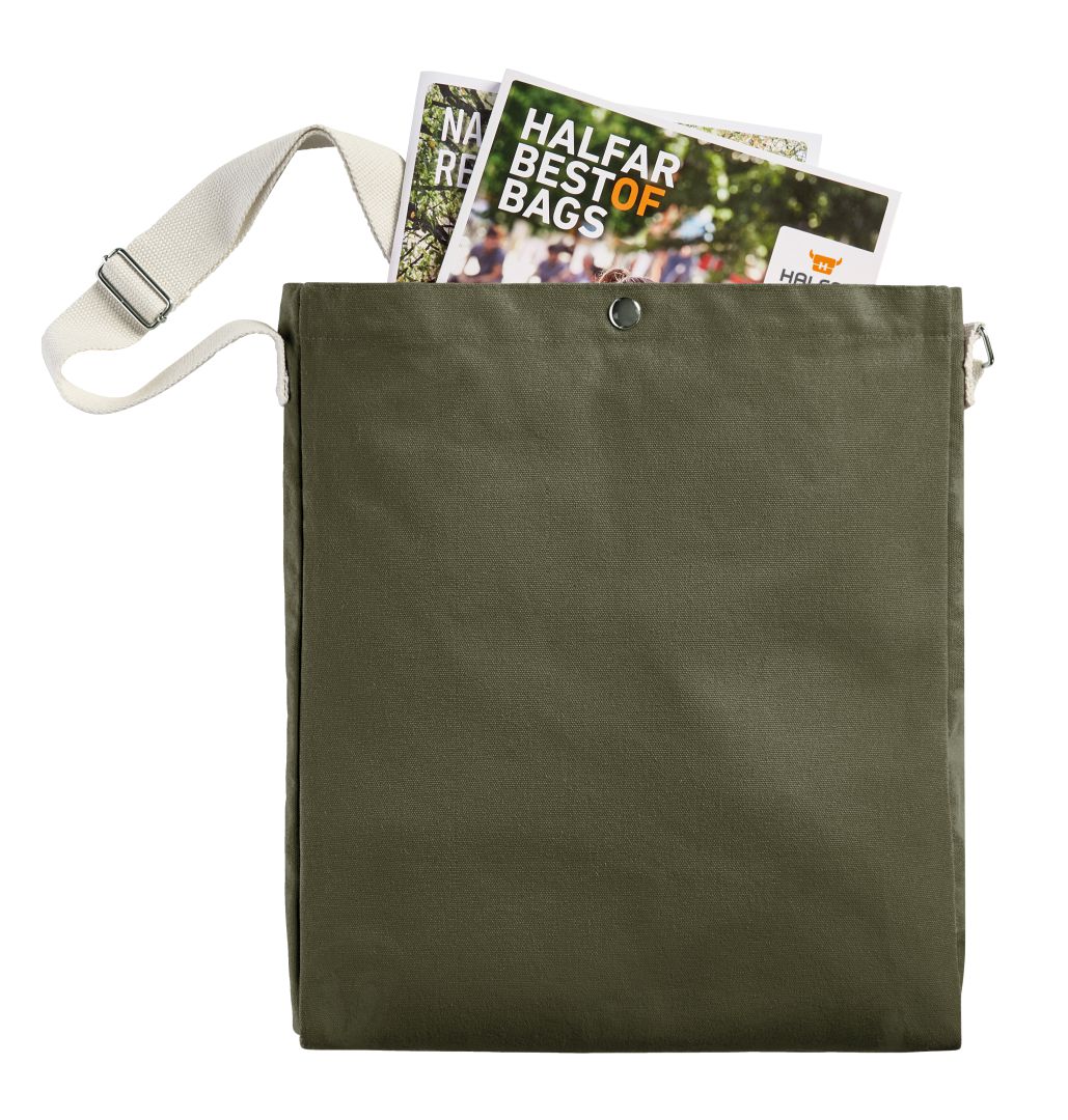gradliniger Shopper mit großer Werbefläche; geräumiges Hauptfach - ideal geeignet für Kataloge und DIN A4-Unterlagen, mit Druckknopf verschließbar; breiter, längenverstellbarer Baumwoll-Schultergurt